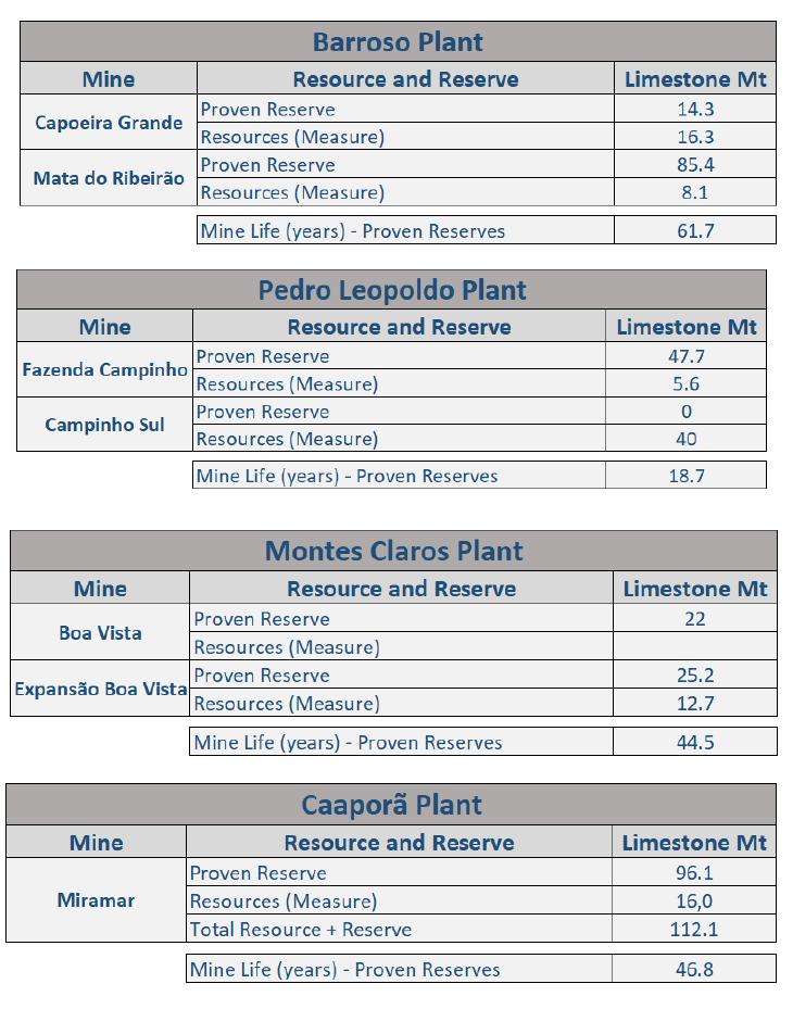 Each property includes a mine: (i) Elizabeth Plant – Pitimbu Mine; (ii) Barroso Plant – Capoeira Grande Mine and Mata do Ribeirão Mine; (iii) Pedro Leopoldo Plant – Pedro Leopoldo Mine (Fazenda Campinho); (iv) Cantagalo Plant – Cantagalo (Saudade Mine); (v) Caaporã Plant – Caaporã (Miramar Mine); (vi) Montes Claros Plant – Mining complex of Montes Claros; and (vii) Arcos – Bocaina Mine.
