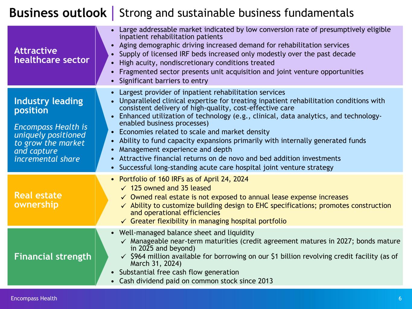 Encompass Health 6 Attractive healthcare sector Large addressable market indicated by low conversion rate of presumptively eligible inpatient rehabilitation patients Aging demographic driving increased demand for rehabilitation services Supply of licensed IRF beds increased only modestly over the past decade High acuity, nondiscretionary conditions treated Fragmented sector presents unit acquisition and joint venture opportunities Significant barriers to entry Industry leading position Encompass Health is uniquely positioned to grow the market and capture incremental share Largest provider of inpatient rehabilitation services Unparalleled clinical expertise for treating inpatient rehabilitation conditions with consistent delivery of high-quality, cost-effective care Enhanced utilization of technology (e.g., clinical, data analytics, and technology- enabled business processes) Economies related to scale and market density Ability to fund capacity expansions primarily with internally generated funds Management experience and depth Attractive financial returns on de novo and bed addition investments Successful long-standing acute care hospital joint venture strategy Real estate ownership Portfolio of 160 IRFs as of April 24, 2024 ü 125 owned and 35 leased ü Owned real estate is not exposed to annual lease expense increases ü Ability to customize building design to EHC specifications; promotes construction and operational efficiencies ü Greater flexibility in managing hospital portfolio Financial strength Well-managed balance sheet and liquidity ü Manageable near-term maturities (credit agreement matures in 2027; bonds mature in 2025 and beyond) ü $964 million available for borrowing on our $1 billion revolving credit facility (as of March 31, 2024) Substantial free cash flow generation Cash dividend paid on common stock since 2013 Business outlook Strong and sustainable business fundamentals