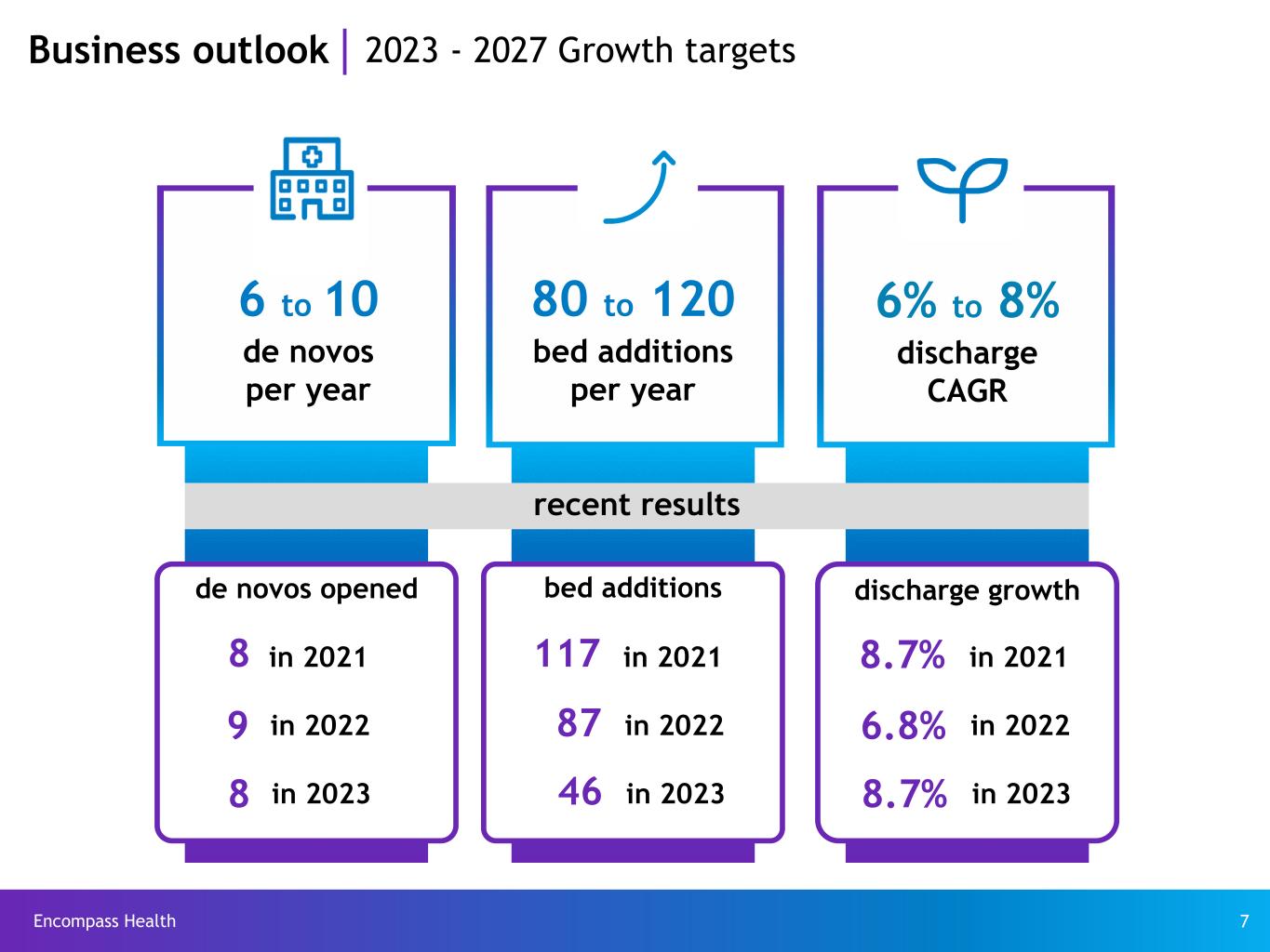 Encompass Health 7l 7 6 to 10 de novos per year 80 to 120 bed additions per year 6% to 8% discharge CAGR Business outlook 2023 - 2027 Growth targets de novos opened 8 9 in 2021 in 2022 bed additions 117 87 in 2021 in 2022 discharge growth 8.7% 6.8% in 2021 in 2022 recent results 8 in 2023 46 in 2023 8.7% in 2023