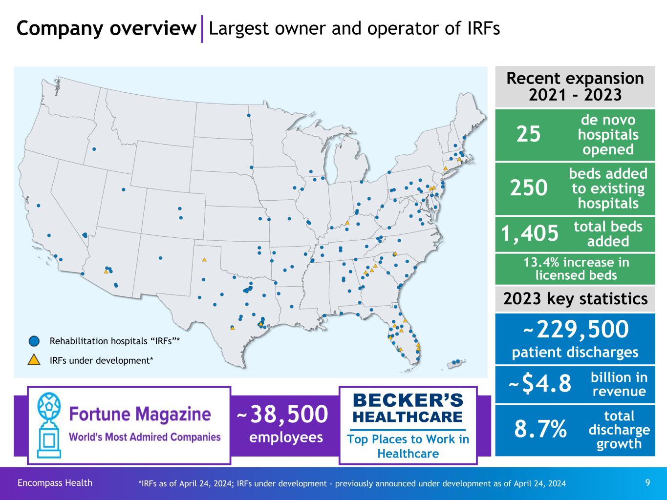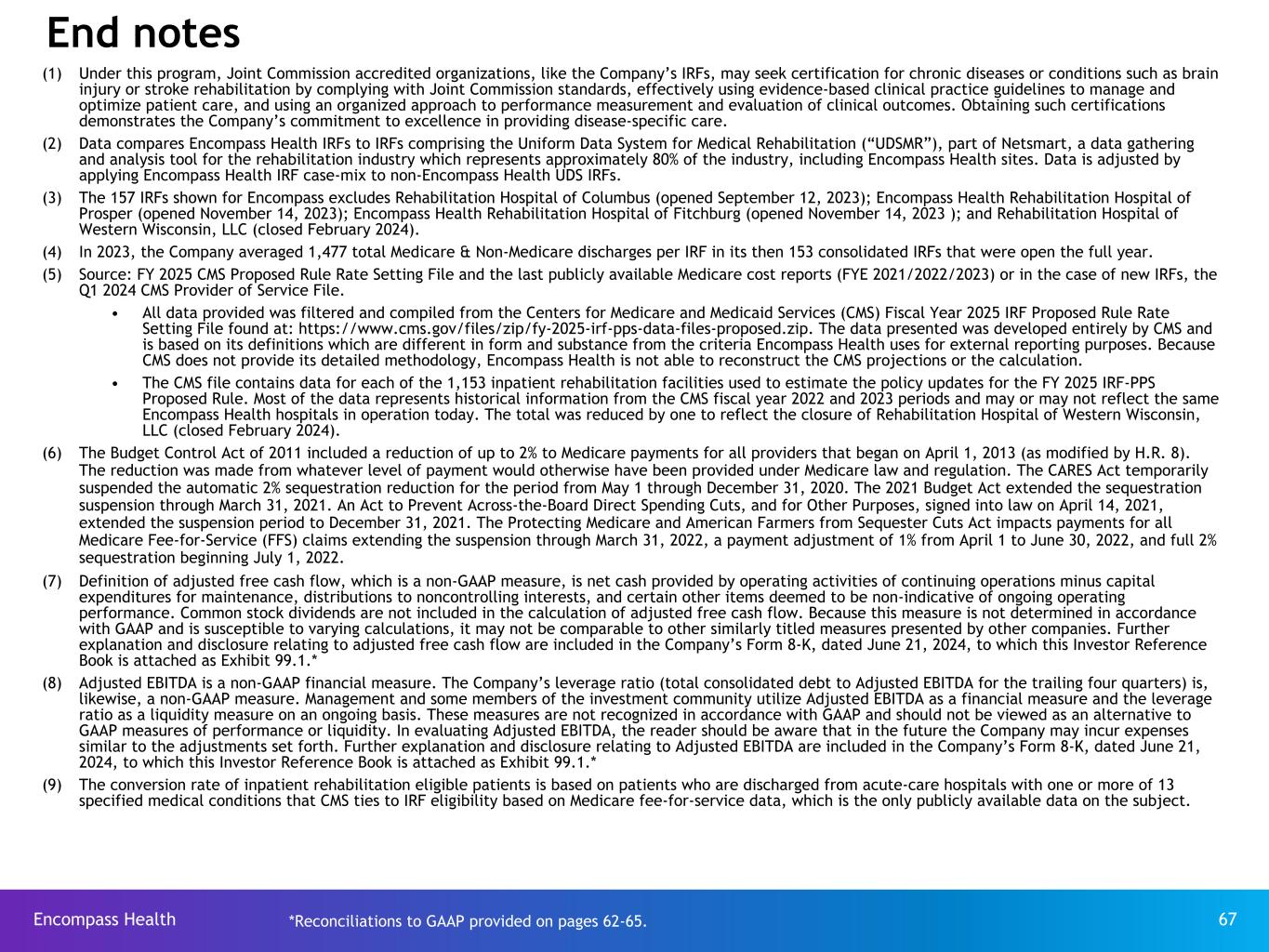 Encompass Health 67 (1) Under this program, Joint Commission accredited organizations, like the Company’s IRFs, may seek certification for chronic diseases or conditions such as brain injury or stroke rehabilitation by complying with Joint Commission standards, effectively using evidence-based clinical practice guidelines to manage and optimize patient care, and using an organized approach to performance measurement and evaluation of clinical outcomes. Obtaining such certifications demonstrates the Company’s commitment to excellence in providing disease-specific care. (2) Data compares Encompass Health IRFs to IRFs comprising the Uniform Data System for Medical Rehabilitation (“UDSMR”), part of Netsmart, a data gathering and analysis tool for the rehabilitation industry which represents approximately 80% of the industry, including Encompass Health sites. Data is adjusted by applying Encompass Health IRF case-mix to non-Encompass Health UDS IRFs. (3) The 157 IRFs shown for Encompass excludes Rehabilitation Hospital of Columbus (opened September 12, 2023); Encompass Health Rehabilitation Hospital of Prosper (opened November 14, 2023); Encompass Health Rehabilitation Hospital of Fitchburg (opened November 14, 2023 ); and Rehabilitation Hospital of Western Wisconsin, LLC (closed February 2024). (4) In 2023, the Company averaged 1,477 total Medicare & Non-Medicare discharges per IRF in its then 153 consolidated IRFs that were open the full year. (5) Source: FY 2025 CMS Proposed Rule Rate Setting File and the last publicly available Medicare cost reports (FYE 2021/2022/2023) or in the case of new IRFs, the Q1 2024 CMS Provider of Service File. • All data provided was filtered and compiled from the Centers for Medicare and Medicaid Services (CMS) Fiscal Year 2025 IRF Proposed Rule Rate Setting File found at: https://www.cms.gov/files/zip/fy-2025-irf-pps-data-files-proposed.zip. The data presented was developed entirely by CMS and is based on its definitions which are different in form and substance from the criteria Encompass Health uses for external reporting purposes. Because CMS does not provide its detailed methodology, Encompass Health is not able to reconstruct the CMS projections or the calculation. • The CMS file contains data for each of the 1,153 inpatient rehabilitation facilities used to estimate the policy updates for the FY 2025 IRF-PPS Proposed Rule. Most of the data represents historical information from the CMS fiscal year 2022 and 2023 periods and may or may not reflect the same Encompass Health hospitals in operation today. The total was reduced by one to reflect the closure of Rehabilitation Hospital of Western Wisconsin, LLC (closed February 2024). (6) The Budget Control Act of 2011 included a reduction of up to 2% to Medicare payments for all providers that began on April 1, 2013 (as modified by H.R. 8). The reduction was made from whatever level of payment would otherwise have been provided under Medicare law and regulation. The CARES Act temporarily suspended the automatic 2% sequestration reduction for the period from May 1 through December 31, 2020. The 2021 Budget Act extended the sequestration suspension through March 31, 2021. An Act to Prevent Across-the-Board Direct Spending Cuts, and for Other Purposes, signed into law on April 14, 2021, extended the suspension period to December 31, 2021. The Protecting Medicare and American Farmers from Sequester Cuts Act impacts payments for all Medicare Fee-for-Service (FFS) claims extending the suspension through March 31, 2022, a payment adjustment of 1% from April 1 to June 30, 2022, and full 2% sequestration beginning July 1, 2022. (7) Definition of adjusted free cash flow, which is a non-GAAP measure, is net cash provided by operating activities of continuing operations minus capital expenditures for maintenance, distributions to noncontrolling interests, and certain other items deemed to be non-indicative of ongoing operating performance. Common stock dividends are not included in the calculation of adjusted free cash flow. Because this measure is not determined in accordance with GAAP and is susceptible to varying calculations, it may not be comparable to other similarly titled measures presented by other companies. Further explanation and disclosure relating to adjusted free cash flow are included in the Company’s Form 8-K, dated June 21, 2024, to which this Investor Reference Book is attached as Exhibit 99.1.* (8) Adjusted EBITDA is a non-GAAP financial measure. The Company’s leverage ratio (total consolidated debt to Adjusted EBITDA for the trailing four quarters) is, likewise, a non-GAAP measure. Management and some members of the investment community utilize Adjusted EBITDA as a financial measure and the leverage ratio as a liquidity measure on an ongoing basis. These measures are not recognized in accordance with GAAP and should not be viewed as an alternative to GAAP measures of performance or liquidity. In evaluating Adjusted EBITDA, the reader should be aware that in the future the Company may incur expenses similar to the adjustments set forth. Further explanation and disclosure relating to Adjusted EBITDA are included in the Company’s Form 8-K, dated June 21, 2024, to which this Investor Reference Book is attached as Exhibit 99.1.* (9) The conversion rate of inpatient rehabilitation eligible patients is based on patients who are discharged from acute-care hospitals with one or more of 13 specified medical conditions that CMS ties to IRF eligibility based on Medicare fee-for-service data, which is the only publicly available data on the subject. End notes *Reconciliations to GAAP provided on pages 62-65.