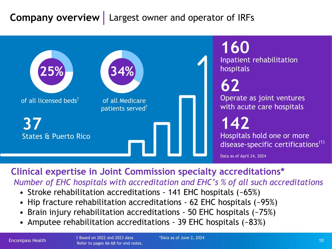 Encompass Health 9 ~38,500 employees Rehabilitation hospitals “IRFs”* IRFs under development* *IRFs as of April 24, 2024; IRFs under development - previously announced under development as of April 24, 2024 Company overview Largest owner and operator of IRFs 2023 key statistics ~229,500 patient discharges ~$4.8 billion in revenue 8.7% total discharge growth Recent expansion 2021 - 2023 25 de novo hospitals opened 250 beds added to existing hospitals 1,405 total beds added 13.4% increase in licensed beds Top Places to Work in Healthcare
