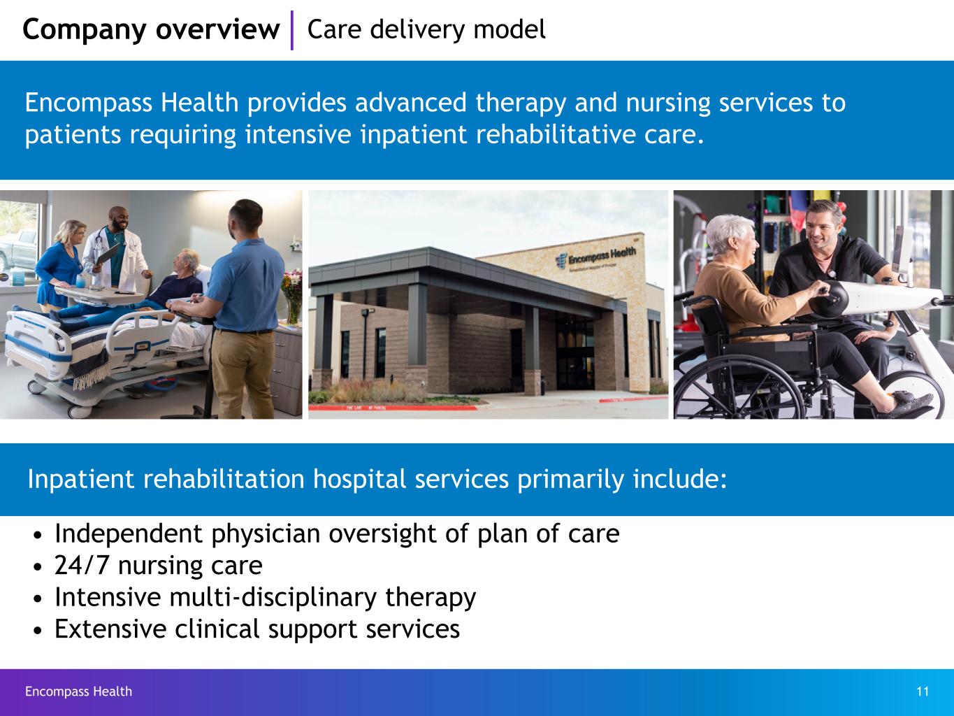 Encompass Health 10 Company overview Largest owner and operator of IRFs Clinical expertise in Joint Commission specialty accreditations* Number of EHC hospitals with accreditation and EHC’s % of all such accreditations • Stroke rehabilitation accreditations - 141 EHC hospitals (~65%) • Hip fracture rehabilitation accreditations - 62 EHC hospitals (~95%) • Brain injury rehabilitation accreditations - 50 EHC hospitals (~75%) • Amputee rehabilitation accreditations - 39 EHC hospitals (~83%) † Based on 2022 and 2023 data *Data as of June 2, 2024 37 States & Puerto Rico 160 Inpatient rehabilitation hospitals 62 Operate as joint ventures with acute care hospitals 142 Hospitals hold one or more disease-specific certifications(1) of all licensed beds† of all Medicare patients served† 25% 34% Refer to pages 66-68 for end notes. Data as of April 24, 2024