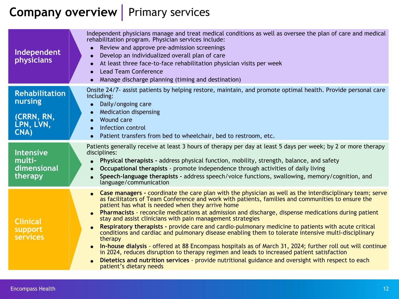 Encompass Health 12 Company overview Primary services Independent physicians Independent physicians manage and treat medical conditions as well as oversee the plan of care and medical rehabilitation program. Physician services include: Review and approve pre-admission screenings Develop an individualized overall plan of care At least three face-to-face rehabilitation physician visits per week Lead Team Conference Manage discharge planning (timing and destination) Rehabilitation nursing (CRRN, RN, LPN, LVN, CNA) Onsite 24/7- assist patients by helping restore, maintain, and promote optimal health. Provide personal care including: Daily/ongoing care Medication dispensing Wound care Infection control Patient transfers from bed to wheelchair, bed to restroom, etc. Intensive multi- dimensional therapy Patients generally receive at least 3 hours of therapy per day at least 5 days per week; by 2 or more therapy disciplines: Physical therapists - address physical function, mobility, strength, balance, and safety Occupational therapists - promote independence through activities of daily living Speech-language therapists - address speech/voice functions, swallowing, memory/cognition, and language/communication Clinical support services Case managers - coordinate the care plan with the physician as well as the interdisciplinary team; serve as facilitators of Team Conference and work with patients, families and communities to ensure the patient has what is needed when they arrive home Pharmacists - reconcile medications at admission and discharge, dispense medications during patient stay and assist clinicians with pain management strategies Respiratory therapists - provide care and cardio-pulmonary medicine to patients with acute critical conditions and cardiac and pulmonary disease enabling them to tolerate intensive multi-disciplinary therapy In-house dialysis - offered at 88 Encompass hospitals as of March 31, 2024; further roll out will continue in 2024, reduces disruption to therapy regimen and leads to increased patient satisfaction Dietetics and nutrition services - provide nutritional guidance and oversight with respect to each patient’s dietary needs