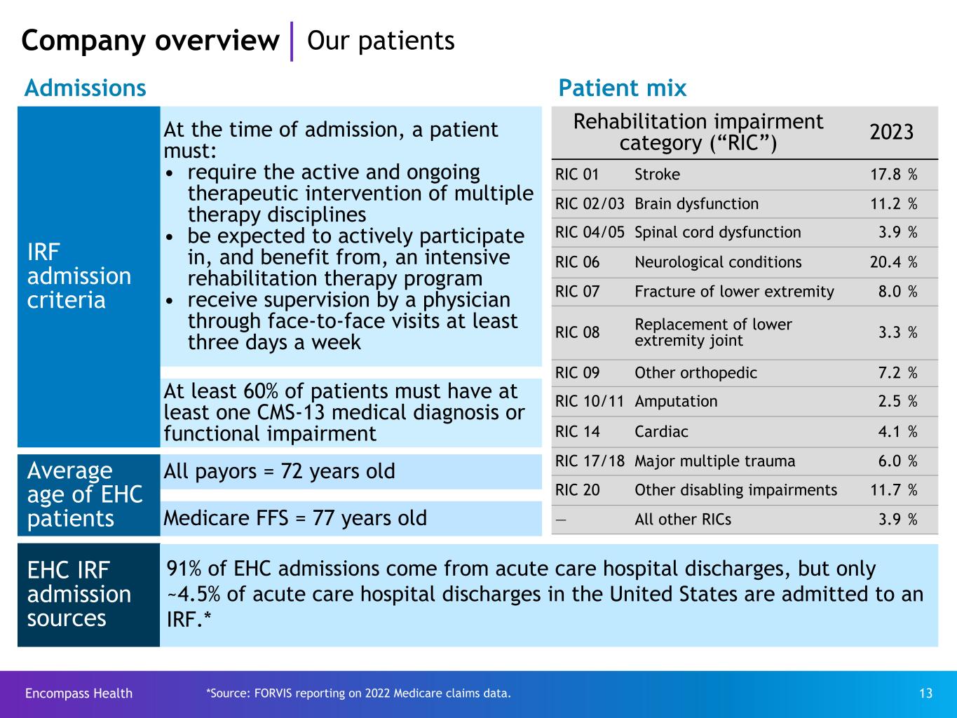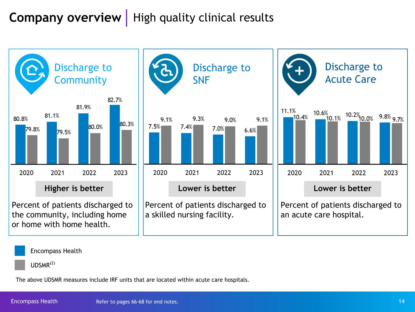 Encompass Health 13 Company overview Our patients IRF admission criteria At the time of admission, a patient must: • require the active and ongoing therapeutic intervention of multiple therapy disciplines • be expected to actively participate in, and benefit from, an intensive rehabilitation therapy program • receive supervision by a physician through face-to-face visits at least three days a week At least 60% of patients must have at least one CMS-13 medical diagnosis or functional impairment Average age of EHC patients All payors = 72 years old Medicare FFS = 77 years old EHC IRF admission sources Rehabilitation impairment category (“RIC”) 2023 RIC 01 Stroke 17.8 % RIC 02/03 Brain dysfunction 11.2 % RIC 04/05 Spinal cord dysfunction 3.9 % RIC 06 Neurological conditions 20.4 % RIC 07 Fracture of lower extremity 8.0 % RIC 08 Replacement of lower extremity joint 3.3 % RIC 09 Other orthopedic 7.2 % RIC 10/11 Amputation 2.5 % RIC 14 Cardiac 4.1 % RIC 17/18 Major multiple trauma 6.0 % RIC 20 Other disabling impairments 11.7 % — All other RICs 3.9 % 91% of EHC admissions come from acute care hospital discharges, but only ~4.5% of acute care hospital discharges in the United States are admitted to an IRF.* Admissions Patient mix *Source: FORVIS reporting on 2022 Medicare claims data.