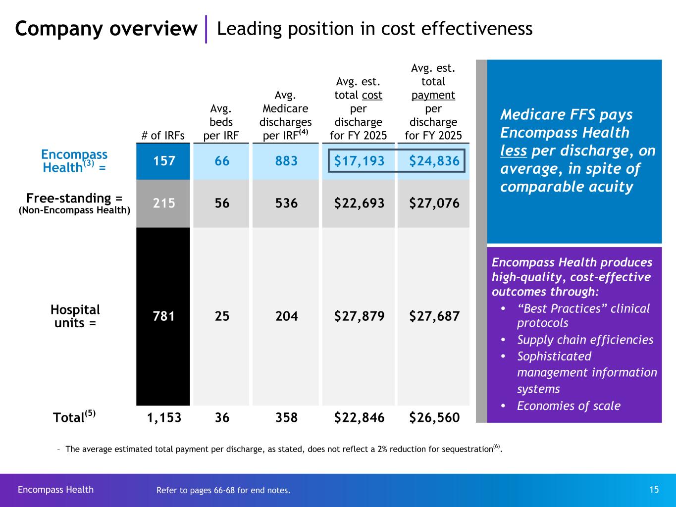 Encompass Health 14 Company overview High quality clinical results Discharge to Community Discharge to SNF Discharge to Acute Care Higher is better Lower is better Lower is better Percent of patients discharged to the community, including home or home with home health. Percent of patients discharged to a skilled nursing facility. Percent of patients discharged to an acute care hospital. Encompass Health UDSMR(2) The above UDSMR measures include IRF units that are located within acute care hospitals. Refer to pages 66-68 for end notes.