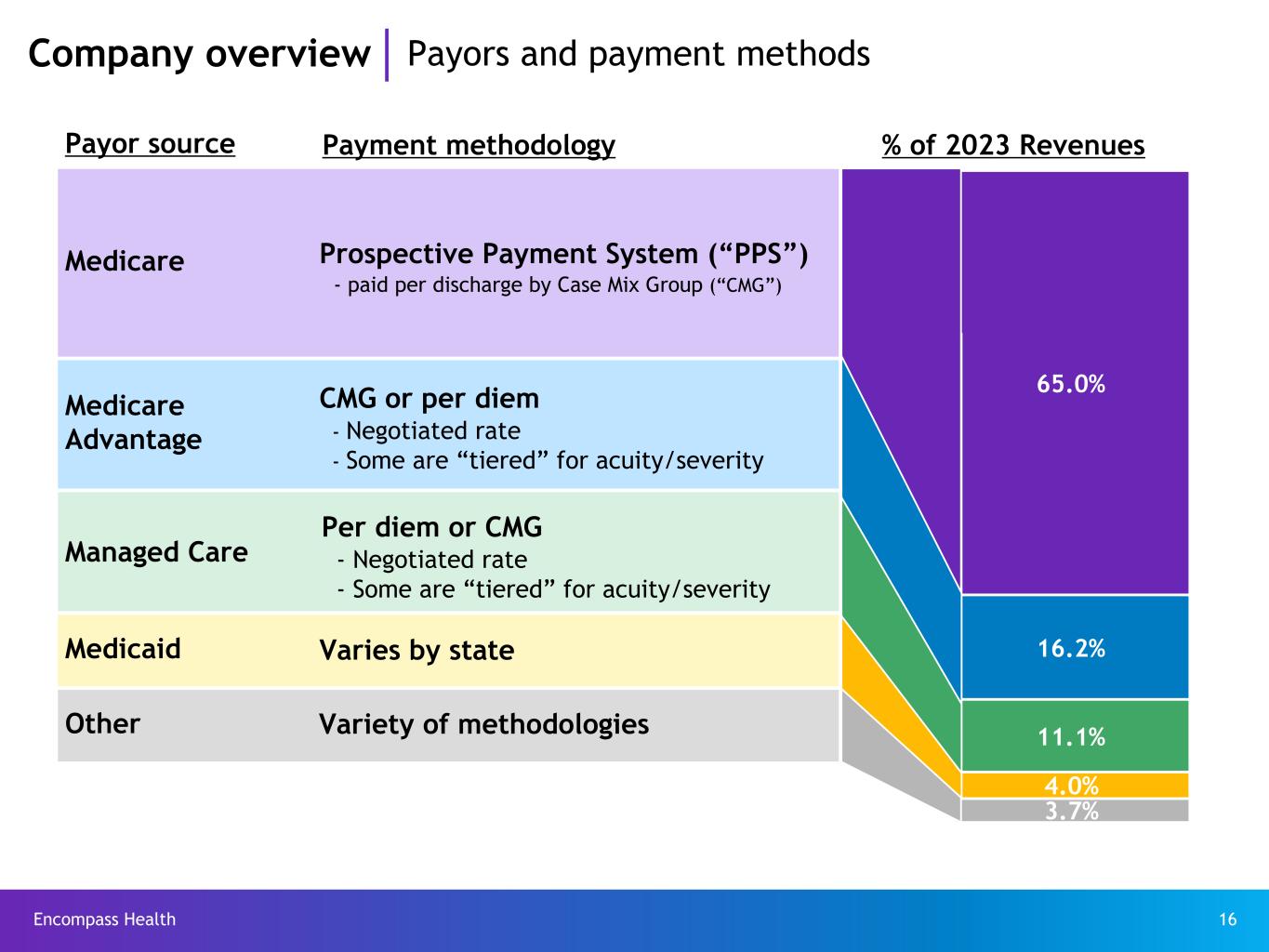 Encompass Health 15 # of IRFs Avg. beds per IRF Avg. Medicare discharges per IRF(4) Avg. est. total cost per discharge for FY 2025 Avg. est. total payment per discharge for FY 2025 Encompass Health(3) = 157 66 883 $17,193 $24,836 Free-standing = (Non-Encompass Health) 215 56 536 $22,693 $27,076 Hospital units = 781 25 204 $27,879 $27,687 Total(5) 1,153 36 358 $22,846 $26,560 Medicare FFS pays Encompass Health less per discharge, on average, in spite of comparable acuity Encompass Health produces high-quality, cost-effective outcomes through: “Best Practices” clinical protocols Supply chain efficiencies Sophisticated management information systems Economies of scale Company overview Leading position in cost effectiveness – The average estimated total payment per discharge, as stated, does not reflect a 2% reduction for sequestration(6). Refer to pages 66-68 for end notes.