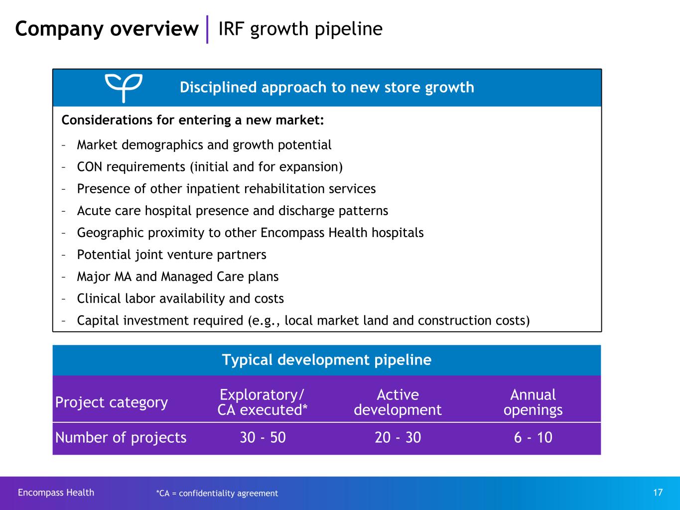 Encompass Health 16 65.0% 16.2% 11.1% 4.0% 3.7% % of 2023 Revenues Medicare Prospective Payment System (“PPS”) - paid per discharge by Case Mix Group (“CMG”) Medicare Advantage CMG or per diem - Negotiated rate - Some are “tiered” for acuity/severity Managed Care Per diem or CMG - Negotiated rate - Some are “tiered” for acuity/severity Medicaid Varies by state Other Variety of methodologies Payor source Payment methodology Company overview Payors and payment methods