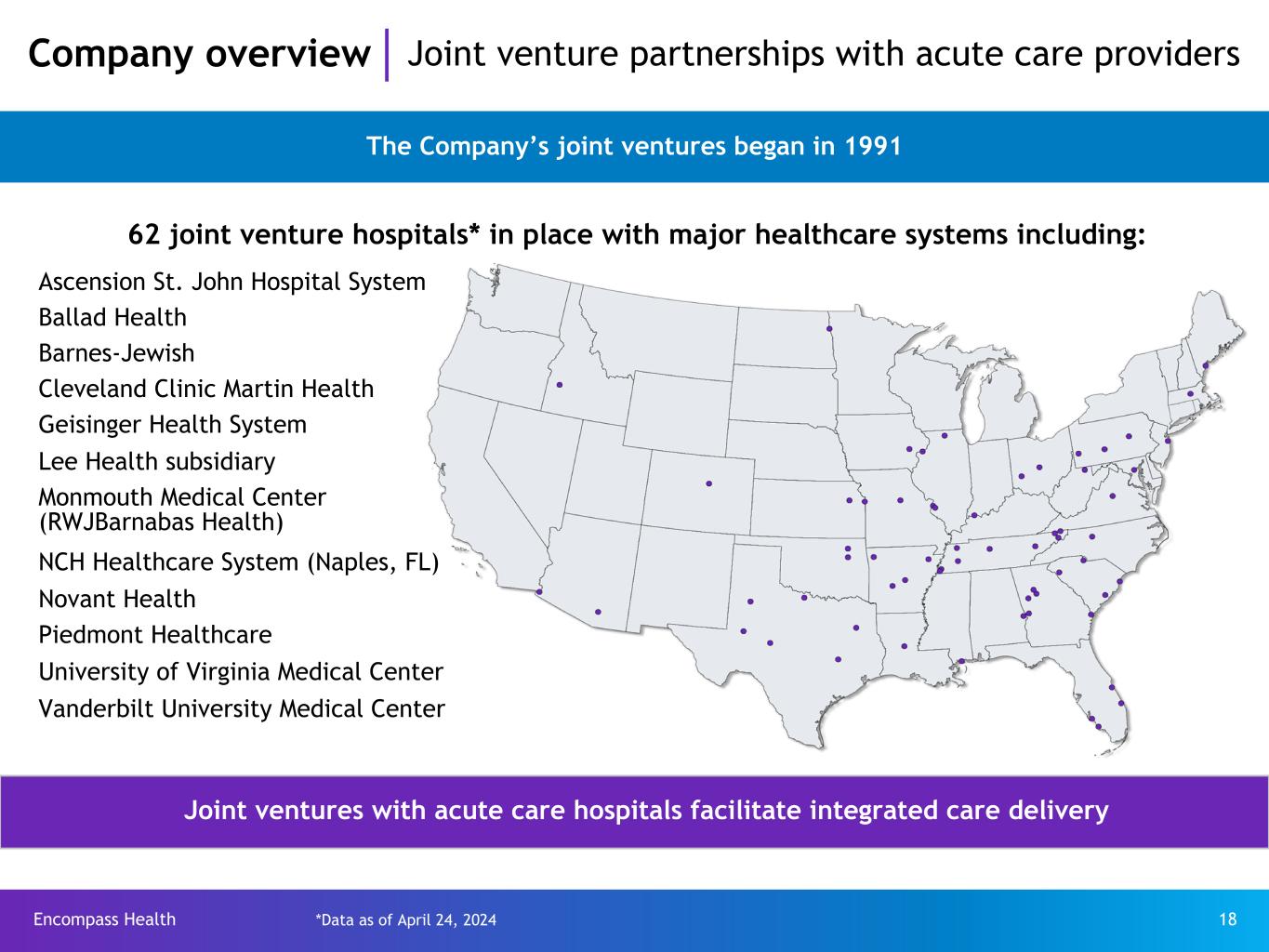Encompass Health 17 Disciplined approach to new store growth Considerations for entering a new market: – Market demographics and growth potential – CON requirements (initial and for expansion) – Presence of other inpatient rehabilitation services – Acute care hospital presence and discharge patterns – Geographic proximity to other Encompass Health hospitals – Potential joint venture partners – Major MA and Managed Care plans – Clinical labor availability and costs – Capital investment required (e.g., local market land and construction costs) *CA = confidentiality agreement Company overview IRF growth pipeline Typical development pipeline Project category Exploratory/ CA executed* Active development Annual openings Number of projects 30 - 50 20 - 30 6 - 10