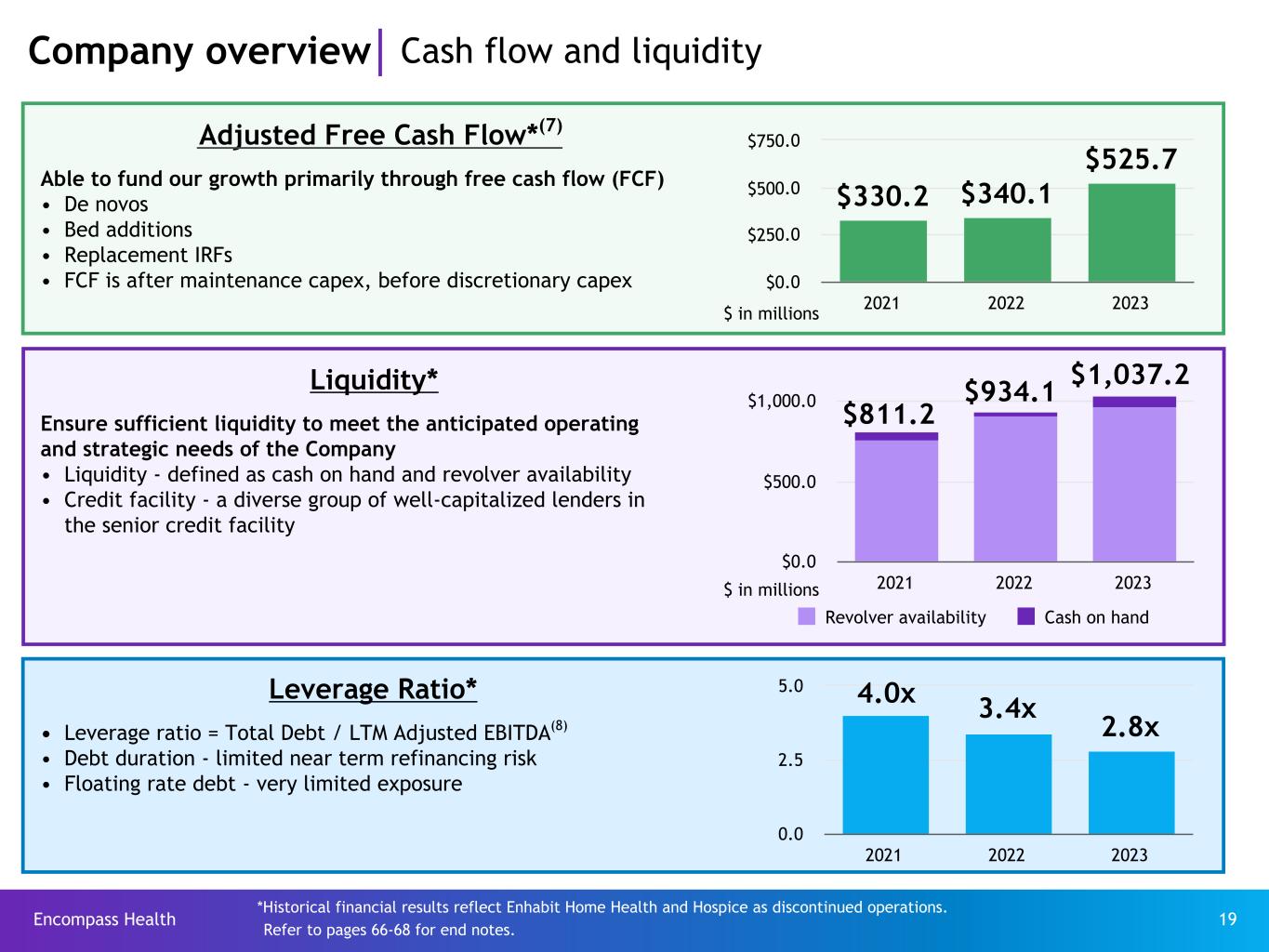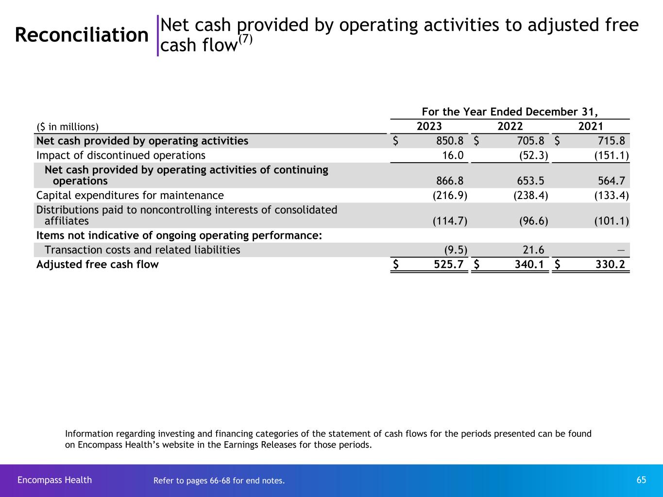 Encompass Health 65 Reconciliation Net cash provided by operating activities to adjusted free cash flow(7) For the Year Ended December 31, ($ in millions) 2023 2022 2021 Net cash provided by operating activities $ 850.8 $ 705.8 $ 715.8 Impact of discontinued operations 16.0 (52.3) (151.1) Net cash provided by operating activities of continuing operations 866.8 653.5 564.7 Capital expenditures for maintenance (216.9) (238.4) (133.4) Distributions paid to noncontrolling interests of consolidated affiliates (114.7) (96.6) (101.1) Items not indicative of ongoing operating performance: Transaction costs and related liabilities (9.5) 21.6 — Adjusted free cash flow $ 525.7 $ 340.1 $ 330.2 Information regarding investing and financing categories of the statement of cash flows for the periods presented can be found on Encompass Health’s website in the Earnings Releases for those periods. Refer to pages 66-68 for end notes.