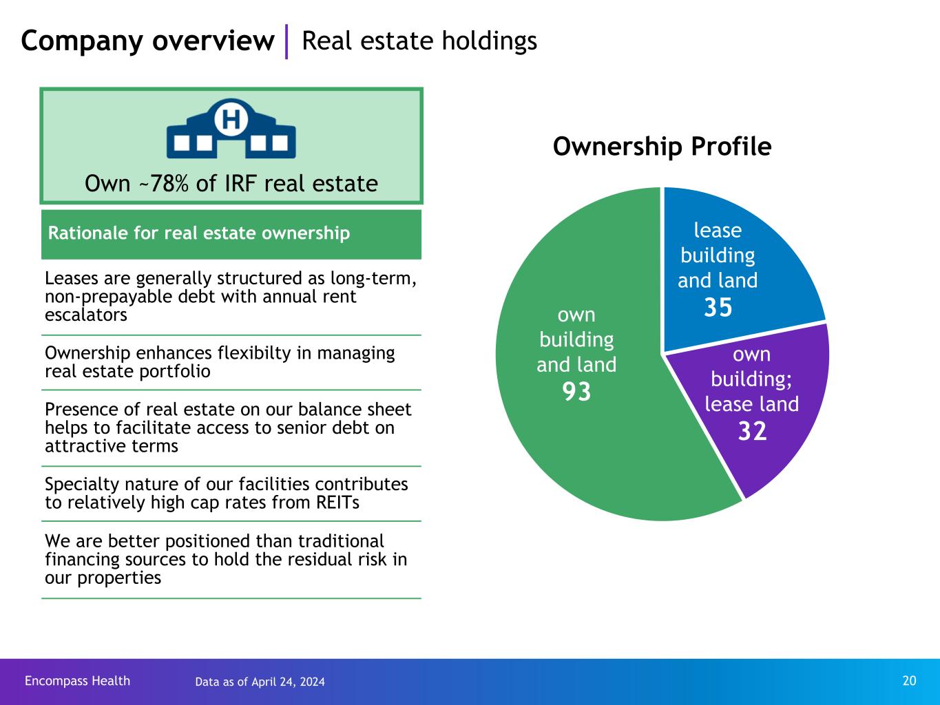 Encompass Health 20 Company overview Real estate holdings Own ~78% of IRF real estate Rationale for real estate ownership Leases are generally structured as long-term, non-prepayable debt with annual rent escalators Ownership enhances flexibilty in managing real estate portfolio Presence of real estate on our balance sheet helps to facilitate access to senior debt on attractive terms Specialty nature of our facilities contributes to relatively high cap rates from REITs We are better positioned than traditional financing sources to hold the residual risk in our properties Ownership Profile own building and land 93 lease building and land 35 own building; lease land 32 Data as of April 24, 2024