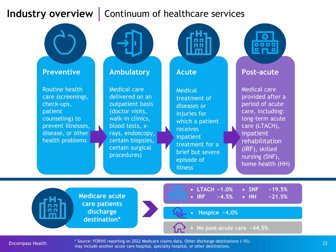 Encompass Health 22 Preventive Routine health care (screenings, check-ups, patient counseling) to prevent illnesses, disease, or other health problems Acute Medical treatment of diseases or injuries for which a patient receives inpatient treatment for a brief but severe episode of illness Ambulatory Medical care delivered on an outpatient basis (doctor visits, walk-in clinics, blood tests, x- rays, endoscopy, certain biopsies, certain surgical procedures) Post-acute Medical care provided after a period of acute care, including: long-term acute care (LTACH), inpatient rehabilitation (IRF), skilled nursing (SNF), home health (HH) Industry overview Continuum of healthcare services Medicare acute care patients discharge destination* LTACH ~1.0% SNF ~19.5% IRF ~4.5% HH ~21.5% Hospice ~4.0% No post-acute care ~44.5% * Source: FORVIS reporting on 2022 Medicare claims data. Other discharge destinations (~5%) may include another acute care hospital, specialty hospital, or other destinations.