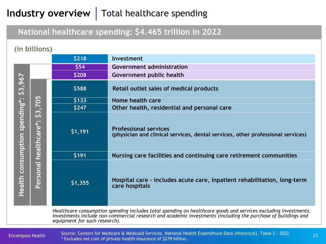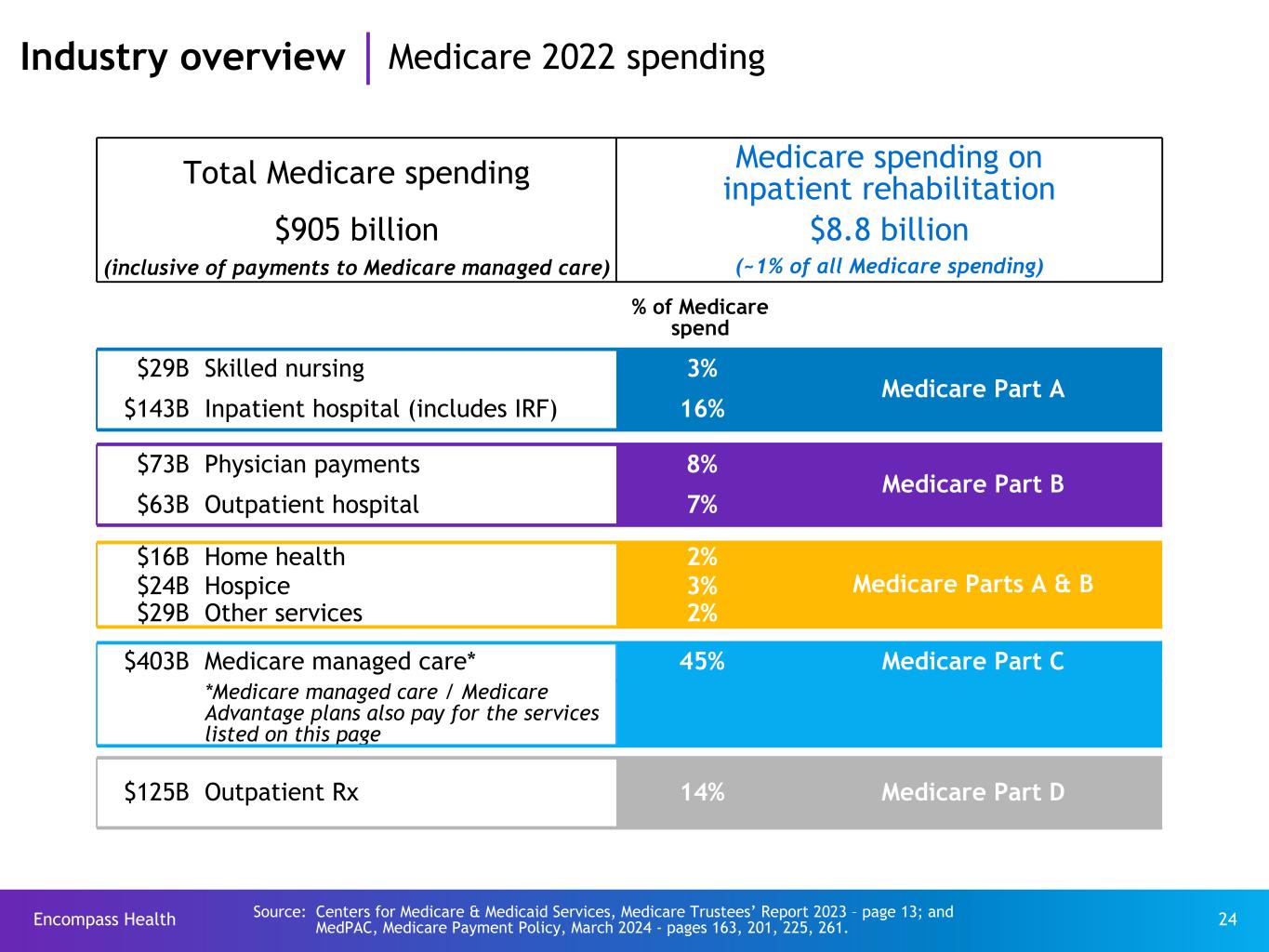 Encompass Health 23 H ea lt h co ns um pt io n sp en di ng *: $ 3, 96 7 (in billions) National healthcare spending: $4.465 trillion in 2022 Pe rs on al h ea lt hc ar e* : $3 ,7 05 $218 Investment $54 Government administration $208 Government public health $588 Retail outlet sales of medical products $133 Home health care $247 Other health, residential and personal care $1,191 Professional services (physician and clinical services, dental services, other professional services) $191 Nursing care facilities and continuing care retirement communities $1,355 Hospital care - includes acute care, inpatient rehabilitation, long-term care hospitals Healthcare consumption spending includes total spending on healthcare goods and services excluding investments. Investments include non-commercial research and academic investments (including the purchase of buildings and equipment for such research). Industry overview Total healthcare spending Source: Centers for Medicare & Medicaid Services, National Health Expenditure Data (Historical), Table 2 - 2022. * Excludes net cost of private health insurance of $279 billion.