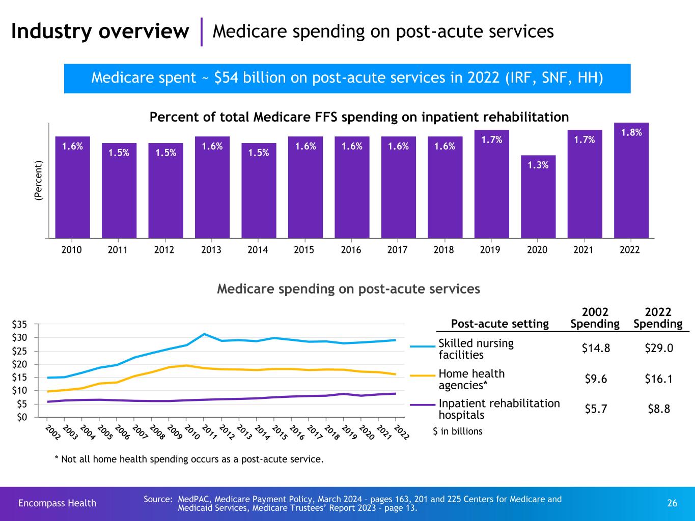 Encompass Health 25 Acute care hospital Home health Inpatient rehabilitation hospital Skilled nursing facility Medicare spending ($ billions) $8.8 $29.0 $16.1* # of Discharges/Beneficiaries^ ~383,000 ~1,800,000 ~2,800,000^ Average length of stay 12.8 days 34.5 days N/A # of Providers ~1,181 ~14,700 ~11,353 Facility ownership mix** For-profit (39%) Non-profit (51%) Gov’t (10%) For-profit (72%) Non-profit (23%) Gov’t (5%) For-profit (93%) Non-profit (7%) Freestanding vs. hospital based Freestanding (29%) Hospital based (71%) Freestanding (97%) Hospital based (3%) Freestanding (87%) Hospital based (13%) Rural vs. urban** Urban (86%) Rural (14%) Urban (73%) Rural (27%) Urban (85%) Rural (15%) (Lowest acuity)(Highest acuity) Source: MedPAC, Medicare Payment Policy, March 2024 - pages 163, 168, 201, 218, 225, 226, and 231; March 2023- page 222 MedPAC, Health Care Spending and the Medicare Program, July 2023 - page 106. * Not all home health spending occurs as a post-acute service. **Home health data represents freestanding agencies only. Industry overview Medicare post-acute care services