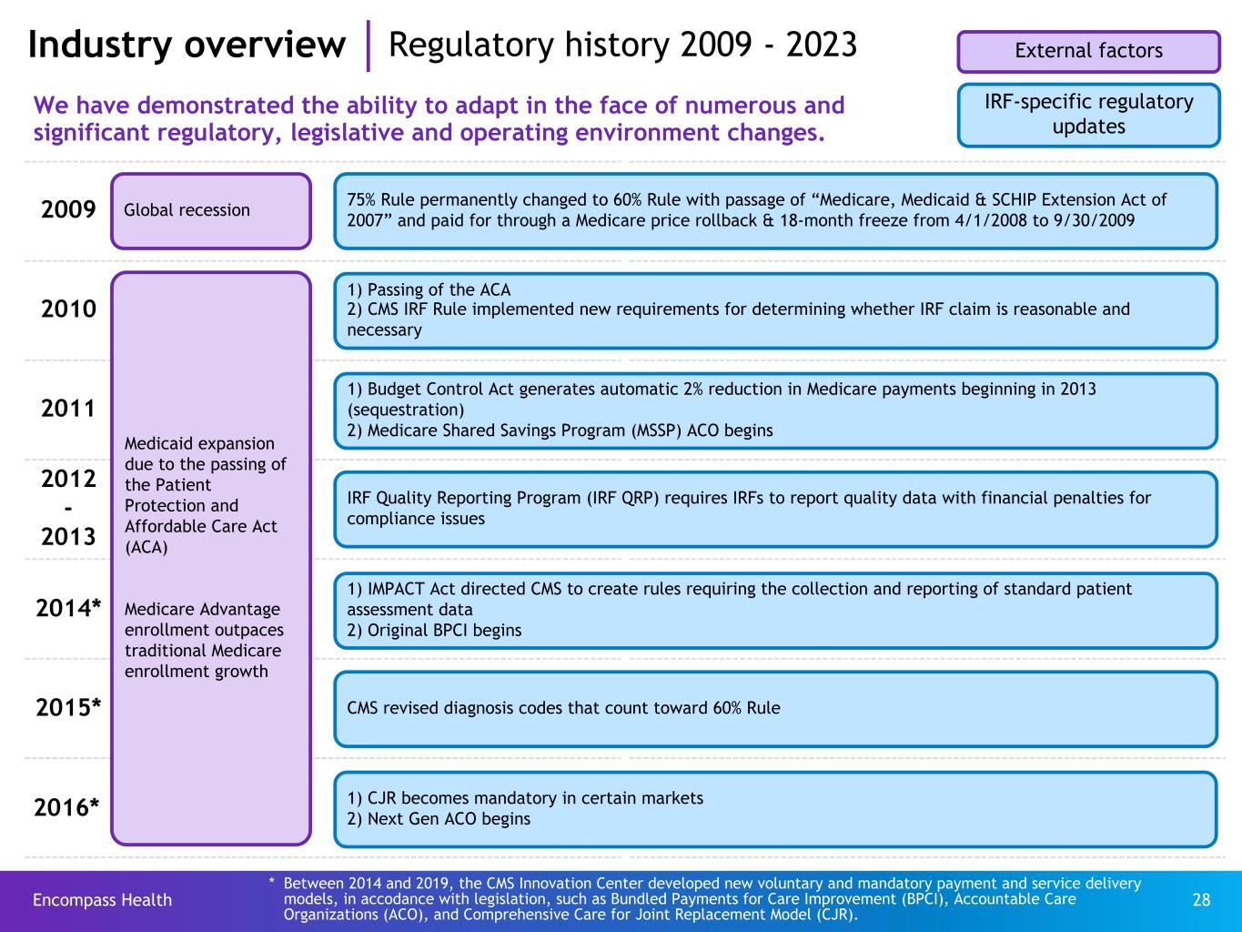 Encompass Health 27 60% or more of an IRF’s annual admissions must have at least one medical diagnosis or functional impairment from a list of 13 compliant conditions (“CMS-13”). Industry overview IRF qualifying conditions CMS-13 qualifying conditions 1 Stroke 2 Brain injury 3 Amputation 4 Spinal cord 5 Fracture of the femur 6 Neurological disorder 7 Multiple trauma 8 Congenital deformity 9 Burns 10 Osteoarthritis (after less intensive setting) 11 Rheumatoid arthritis (after less intensive setting) 12 Joint replacement - Bilateral - Age ≥ 85 - Body mass index > 50 13 Systemic vasculidities (after less intensive setting) Other IRF qualification requirements at the time of a patient’s admission ü Physician approval of preadmission screen and admission ü Patient requires the active and ongoing therapeutic intervention of multiple therapy disciplines, one of which must be physical or occupational therapy ü Patient can reasonably be expected to actively participate in, and benefit from, an intensive interdisciplinary rehabilitation therapy program of 3 hours of therapy a day, 5 days a week ü Requires supervision by a physician through face-to-face visits at least three days per week during the patient’s stay to assess the patient both medically and functionally, as well as to modify the course of treatment as needed