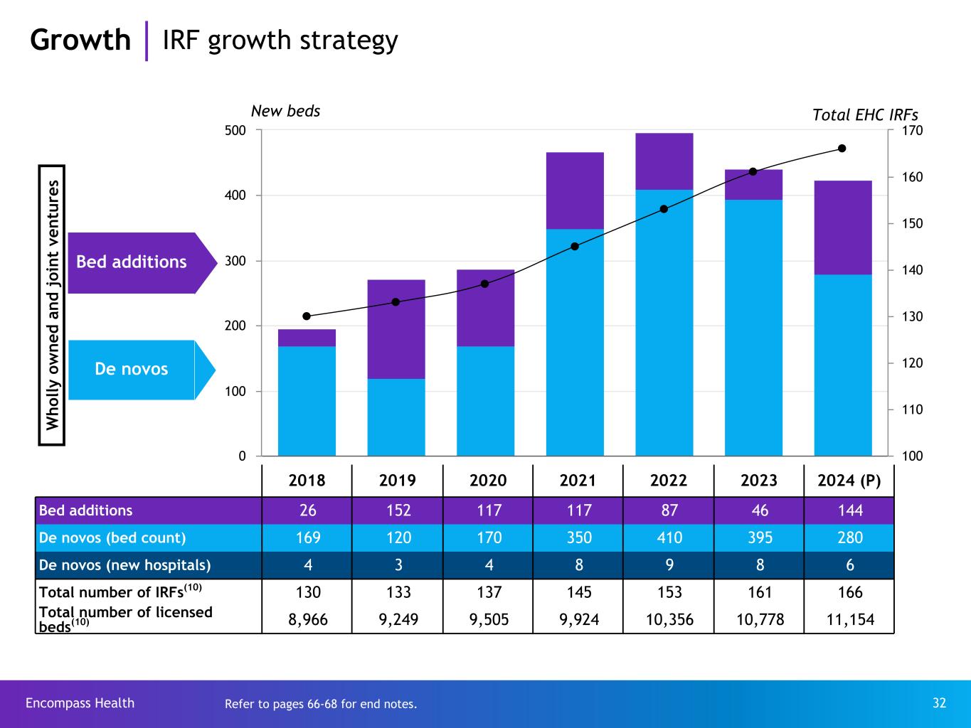 Encompass Health 31 Growth Our rationale for continued expansion of IRF capacity Large, under penetrated and growing market ~14% estimated national conversion rate to IRF(9) Aging demographic (~5% population growth CAGR for our average age patient) Supply of licensed IRF beds has increased only 2.7% since 2010 SNF disintermediation opportunity Non-discretionary conditions Significant barriers to entry and competitive advantages Clinical expertise Access to capital Economies of scale Regulatory and compliance knowledge and infrastructure Long history of successful acute care hospital joint ventures Relationships with referral sources and payors Nationally known and highly regarded brand Attractive financial returns on de novos and bed additions Fuels revenue and EBITDA growth Attractive ROIC Significant operating leverage in bed addition strategy Future period bed additions can increase de novo returns Refer to pages 66-68 for end notes.