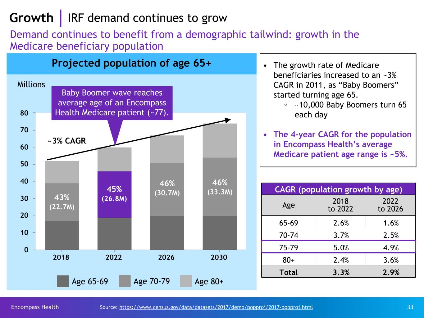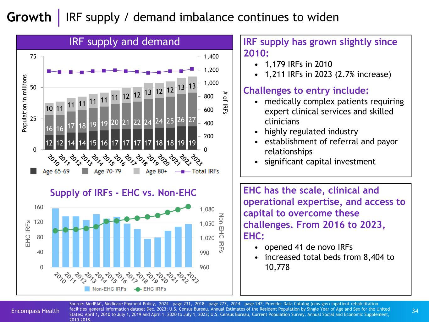 Encompass Health 33 Demand continues to benefit from a demographic tailwind: growth in the Medicare beneficiary population Age 80+Age 70-79Age 65-69 • The growth rate of Medicare beneficiaries increased to an ~3% CAGR in 2011, as “Baby Boomers” started turning age 65. ◦ ~10,000 Baby Boomers turn 65 each day • The 4-year CAGR for the population in Encompass Health’s average Medicare patient age range is ~5%. CAGR (population growth by age) Age 2018 to 2022 2022 to 2026 65-69 2.6% 1.6% 70-74 3.7% 2.5% 75-79 5.0% 4.9% 80+ 2.4% 3.6% Total 3.3% 2.9% Source: https://www.census.gov/data/datasets/2017/demo/popproj/2017-popproj.html 2018 2022 2026 2030 0 10 20 30 40 50 60 70 80 Projected population of age 65+ Millions 43% (22.7M) 45% (26.8M) 46% (30.7M) 46% (33.3M) ~3% CAGR Baby Boomer wave reaches average age of an Encompass Health Medicare patient (~77). Growth IRF demand continues to grow