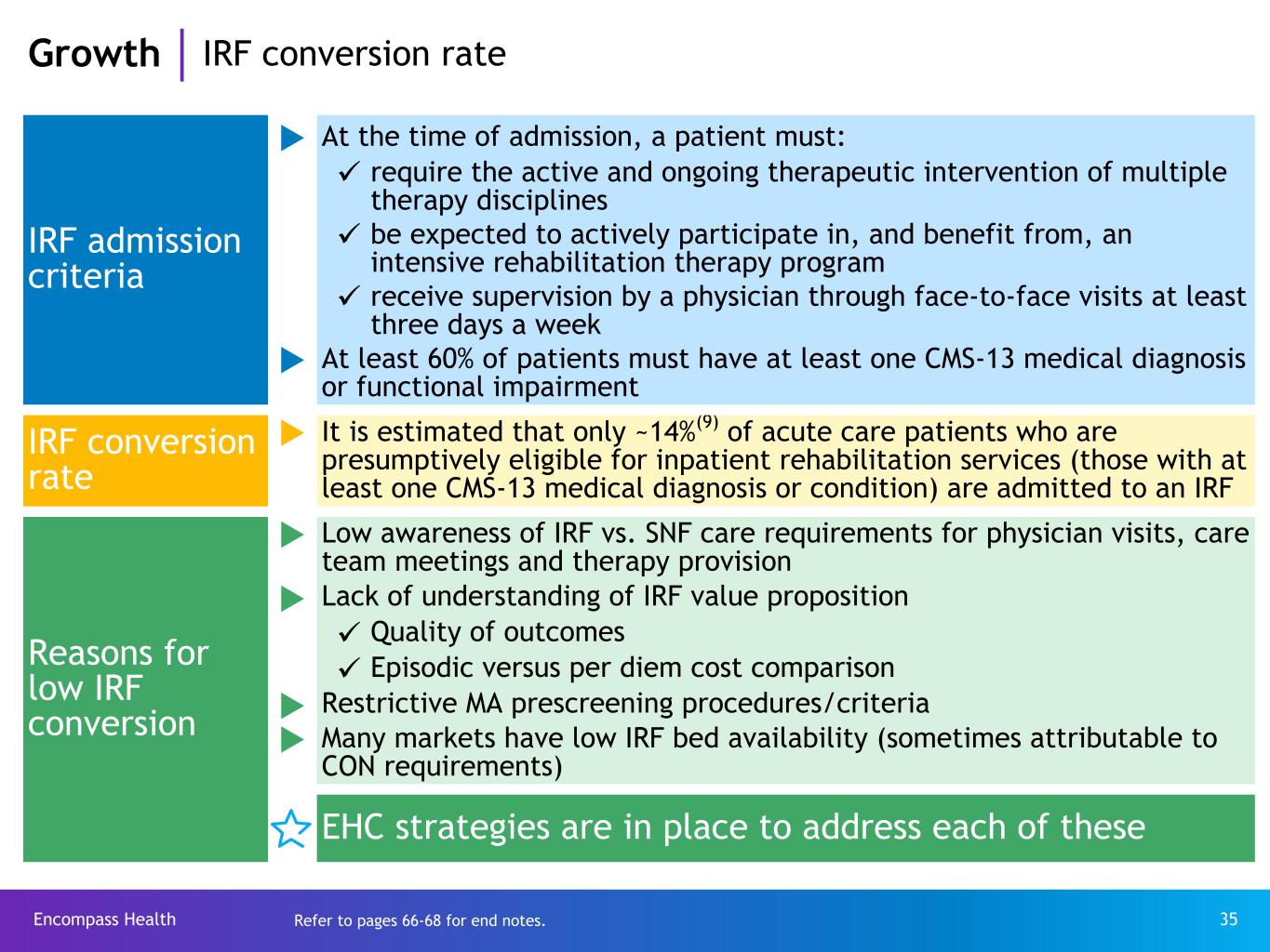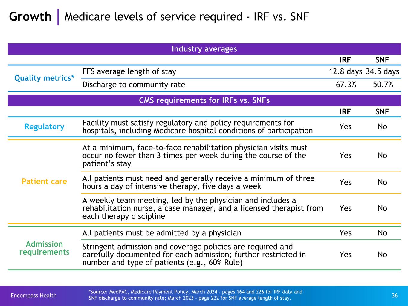 Encompass Health 35 IRF admission criteria u At the time of admission, a patient must: ü require the active and ongoing therapeutic intervention of multiple therapy disciplines ü be expected to actively participate in, and benefit from, an intensive rehabilitation therapy program ü receive supervision by a physician through face-to-face visits at least three days a week u At least 60% of patients must have at least one CMS-13 medical diagnosis or functional impairment IRF conversion rate u It is estimated that only ~14%(9) of acute care patients who are presumptively eligible for inpatient rehabilitation services (those with at least one CMS-13 medical diagnosis or condition) are admitted to an IRF Reasons for low IRF conversion u Low awareness of IRF vs. SNF care requirements for physician visits, care team meetings and therapy provision u Lack of understanding of IRF value proposition ü Quality of outcomes ü Episodic versus per diem cost comparison u Restrictive MA prescreening procedures/criteria u Many markets have low IRF bed availability (sometimes attributable to CON requirements) EHC strategies are in place to address each of these Growth IRF conversion rate Refer to pages 66-68 for end notes.