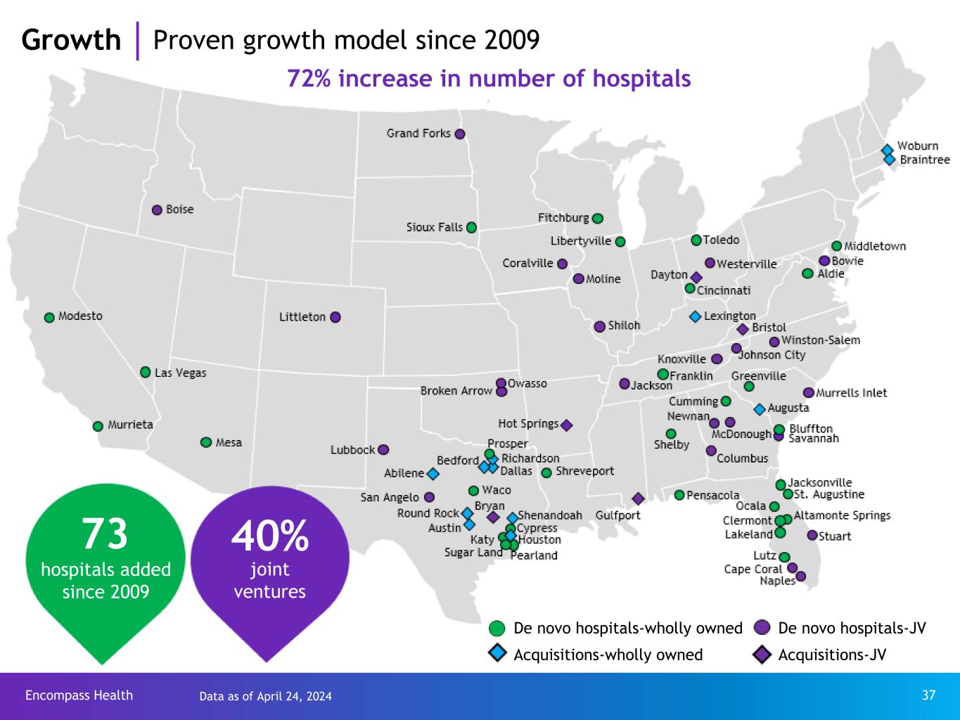 Encompass Health 36 Growth Medicare levels of service required - IRF vs. SNF Industry averages IRF SNF Quality metrics* FFS average length of stay 12.8 days 34.5 days Discharge to community rate 67.3% 50.7% CMS requirements for IRFs vs. SNFs IRF SNF Regulatory Facility must satisfy regulatory and policy requirements for hospitals, including Medicare hospital conditions of participation Yes No Patient care At a minimum, face-to-face rehabilitation physician visits must occur no fewer than 3 times per week during the course of the patient’s stay Yes No All patients must need and generally receive a minimum of three hours a day of intensive therapy, five days a week Yes No A weekly team meeting, led by the physician and includes a rehabilitation nurse, a case manager, and a licensed therapist from each therapy discipline Yes No Admission requirements All patients must be admitted by a physician Yes No Stringent admission and coverage policies are required and carefully documented for each admission; further restricted in number and type of patients (e.g., 60% Rule) Yes No *Source: MedPAC, Medicare Payment Policy, March 2024 - pages 164 and 226 for IRF data and SNF discharge to community rate; March 2023 – page 222 for SNF average length of stay.