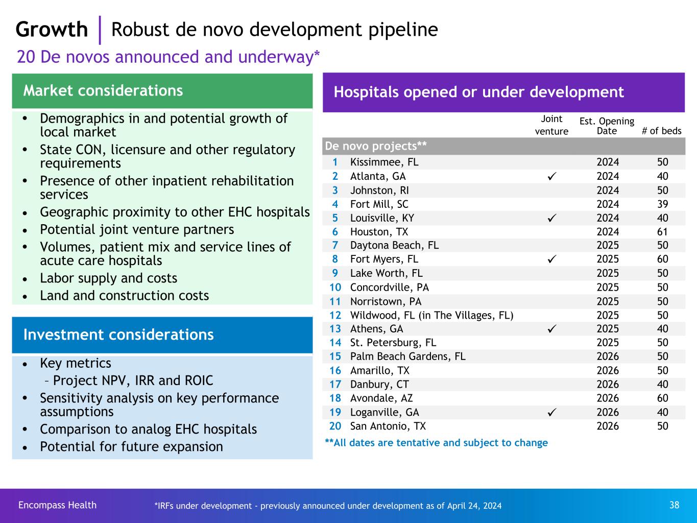 Encompass Health 37 Growth Proven growth model since 2009 46% JV hospitals De novo hospitals-wholly owned Acquisitions-wholly owned De novo hospitals-JV Acquisitions-JV 73 hospitals added since 2009 40% joint ventures 72% increase in number of hospitals Data as of April 24, 2024