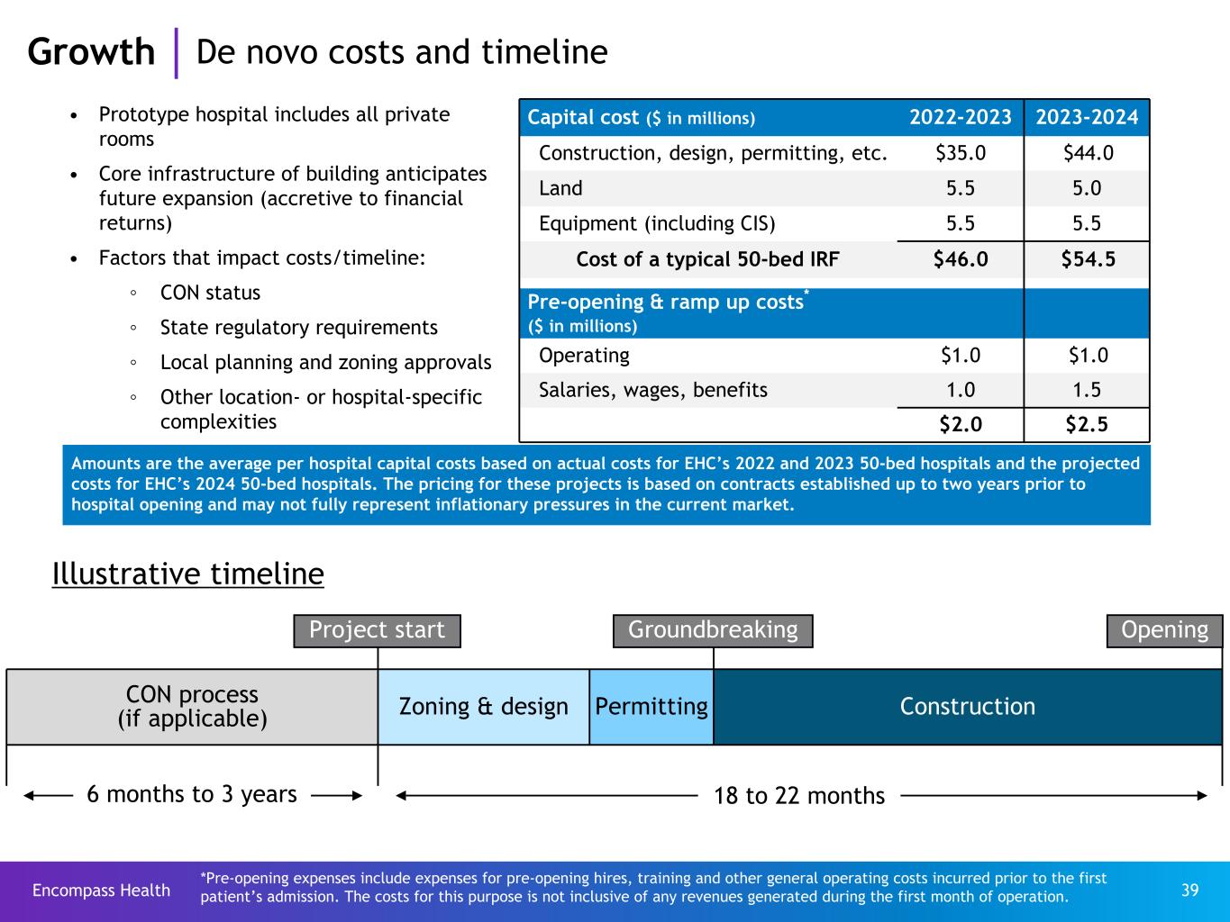 Encompass Health 39 • Prototype hospital includes all private rooms • Core infrastructure of building anticipates future expansion (accretive to financial returns) • Factors that impact costs/timeline: ◦ CON status ◦ State regulatory requirements ◦ Local planning and zoning approvals ◦ Other location- or hospital-specific complexities CON process (if applicable) Zoning & design Permitting Construction OpeningGroundbreaking Capital cost ($ in millions) 2022-2023 2023-2024 Construction, design, permitting, etc. $35.0 $44.0 Land 5.5 5.0 Equipment (including CIS) 5.5 5.5 Cost of a typical 50-bed IRF $46.0 $54.5 Pre-opening & ramp up costs* ($ in millions) Operating $1.0 $1.0 Salaries, wages, benefits 1.0 1.5 $2.0 $2.5 Project start 18 to 22 months6 months to 3 years Illustrative timeline *Pre-opening expenses include expenses for pre-opening hires, training and other general operating costs incurred prior to the first patient’s admission. The costs for this purpose is not inclusive of any revenues generated during the first month of operation. Growth De novo costs and timeline Amounts are the average per hospital capital costs based on actual costs for EHC’s 2022 and 2023 50-bed hospitals and the projected costs for EHC’s 2024 50-bed hospitals. The pricing for these projects is based on contracts established up to two years prior to hospital opening and may not fully represent inflationary pressures in the current market.
