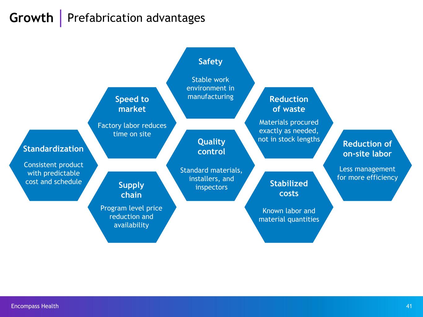Encompass Health 40 Growth De novo project process *Project duration for conventional construction with prefabricated elements ranges from 18 to 22 months based on the specific project characteristics and site development conditions, and the amount of prefabrication. Conventional construction - total project duration: 24 months Conventional with prefabricated elements - total project duration: 22 months* Full hospital prefabrication - estimated total project duration: 16 months Full prefabrication time to completion benefits: • 33% reduction (8 months) compared to conventional construction • 27% reduction (6 months) compared to conventional construction with some elements of prefabrication first patient 6 months design 3 months permitting 14 months construction 1 month turn-over 6 months design 3 months permitting 12 months construction 1 month turn-over 3 months design 3 months permitting 9 months construction 1 month turn-over
