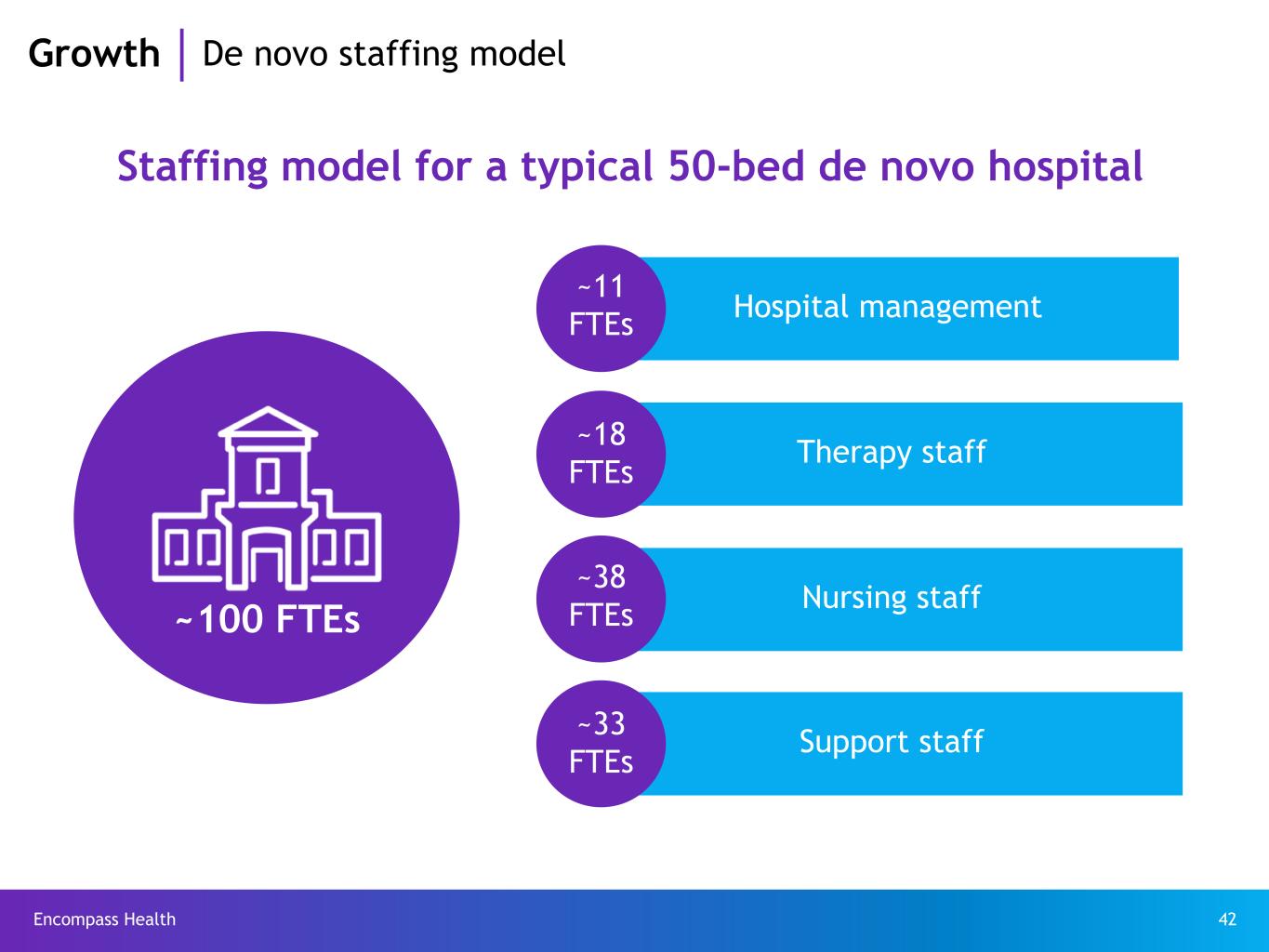 Encompass Health 42 Hospital management Therapy staff Nursing staff Support staff Growth De novo staffing model Staffing model for a typical 50-bed de novo hospital ~100 FTEs ~11 FTEs ~18 FTEs ~38 FTEs ~33 FTEs