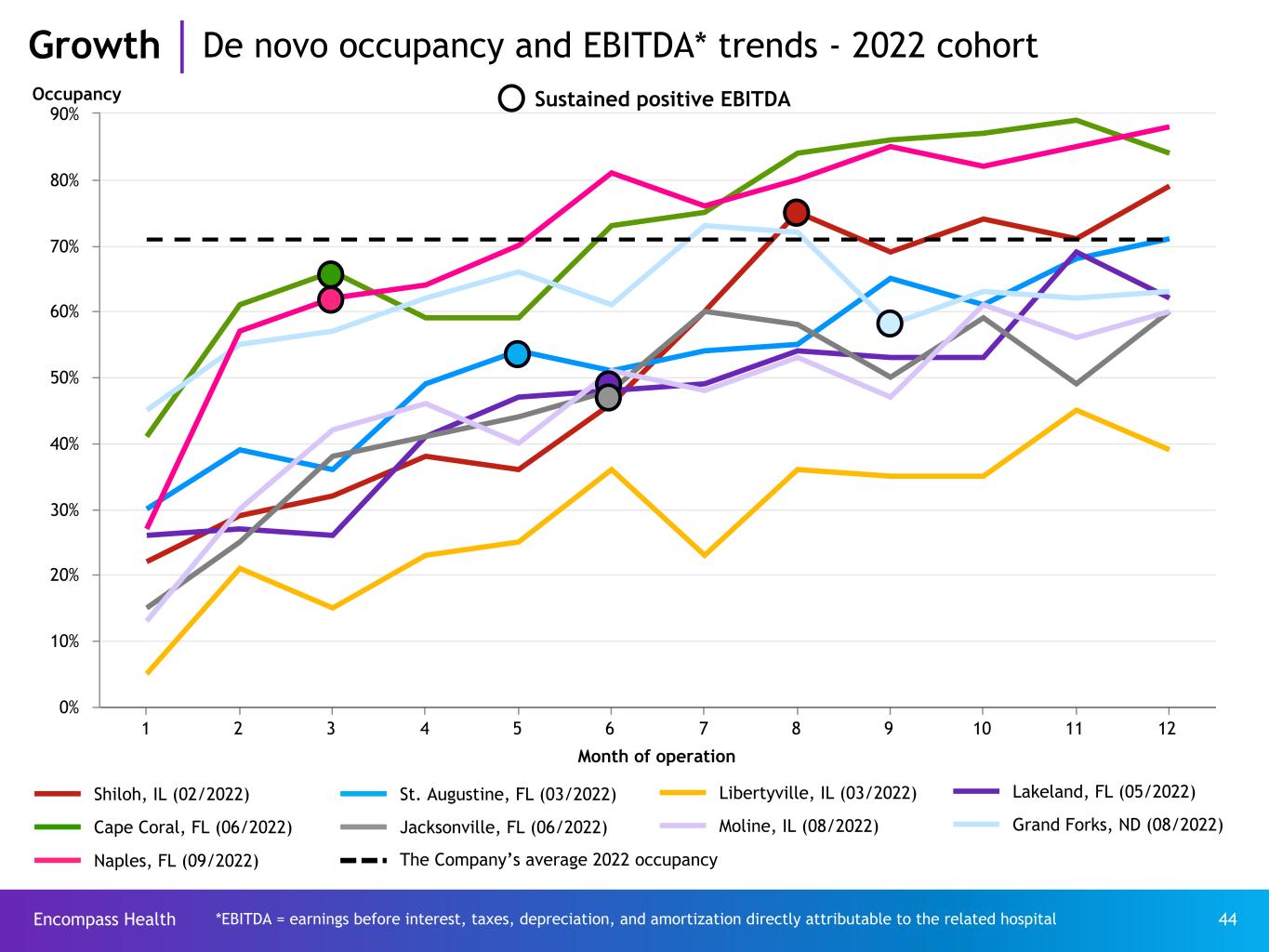 Encompass Health 43 Month of operation 1 2 3 4 5 6 7 8 9 10 11 12 0% 10% 20% 30% 40% 50% 60% 70% 80% 90% 100% Occupancy Sustained positive EBITDA *EBITDA = earnings before interest, taxes, depreciation, and amortization directly attributable to the related hospital Growth De novo occupancy and EBITDA* trends - 2021 cohort San Angelo, TX (03/2021) Waco, TX (08/2021) Pensacola, FL (09/2021) North Tampa, FL (04/2021) Greenville, SC (08/2021) Henry County, GA (10/2021) Cumming, GA (06/2021) Shreveport, LA (08/2021) The Company’s average 2021 occupancy
