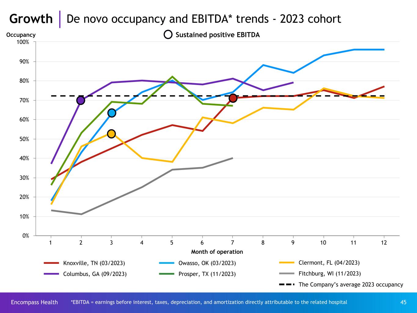 Encompass Health 44 Month of operation 1 2 3 4 5 6 7 8 9 10 11 12 0% 10% 20% 30% 40% 50% 60% 70% 80% 90% Occupancy Sustained positive EBITDA *EBITDA = earnings before interest, taxes, depreciation, and amortization directly attributable to the related hospital Growth De novo occupancy and EBITDA* trends - 2022 cohort Shiloh, IL (02/2022) Cape Coral, FL (06/2022) Naples, FL (09/2022) St. Augustine, FL (03/2022) Jacksonville, FL (06/2022) Libertyville, IL (03/2022) Moline, IL (08/2022) The Company’s average 2022 occupancy Lakeland, FL (05/2022) Grand Forks, ND (08/2022)