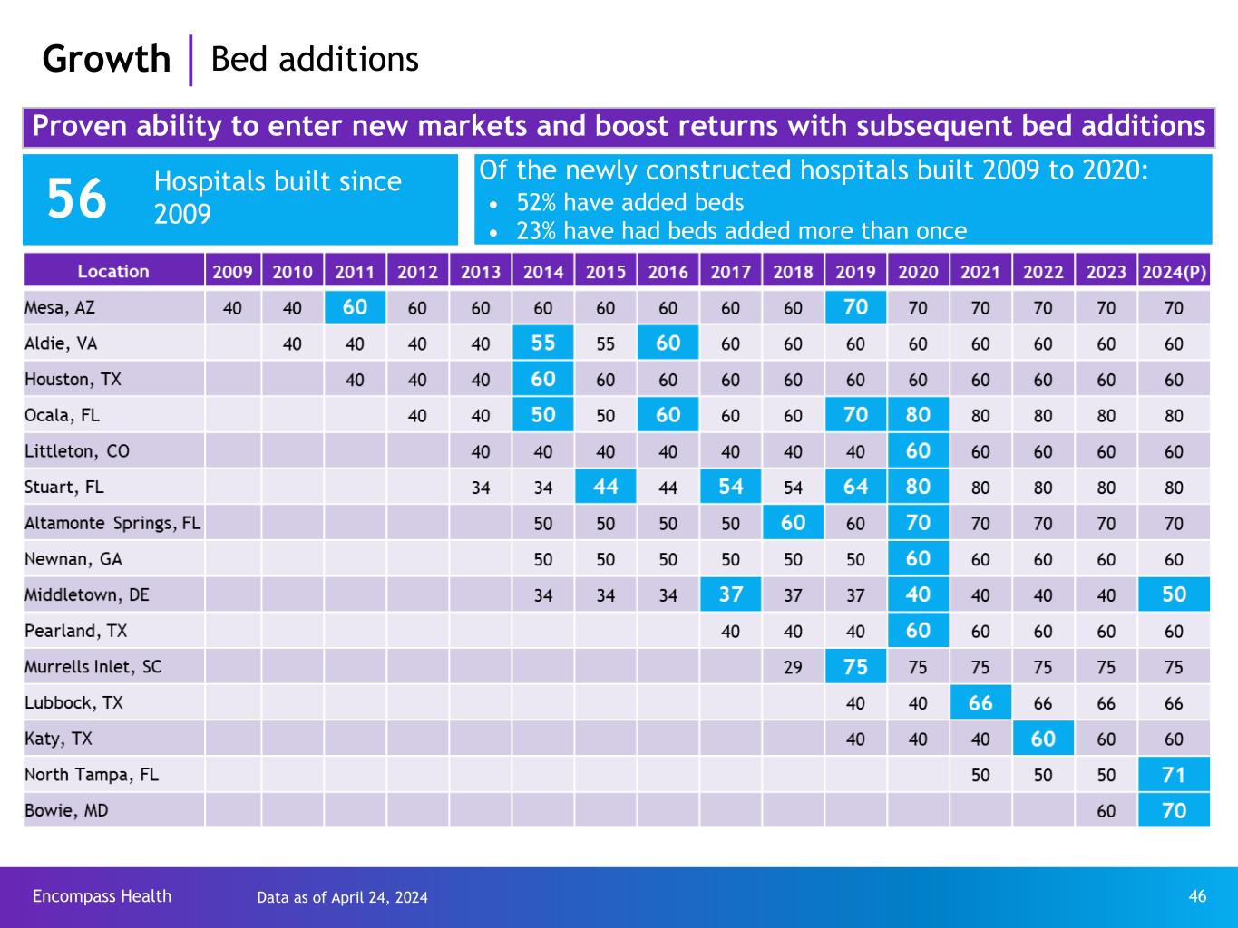 Encompass Health 45 Month of operation 1 2 3 4 5 6 7 8 9 10 11 12 0% 10% 20% 30% 40% 50% 60% 70% 80% 90% 100% Occupancy Sustained positive EBITDA *EBITDA = earnings before interest, taxes, depreciation, and amortization directly attributable to the related hospital Growth De novo occupancy and EBITDA* trends - 2023 cohort Knoxville, TN (03/2023) Columbus, GA (09/2023) Owasso, OK (03/2023) Prosper, TX (11/2023) Clermont, FL (04/2023) Fitchburg, WI (11/2023) The Company’s average 2023 occupancy
