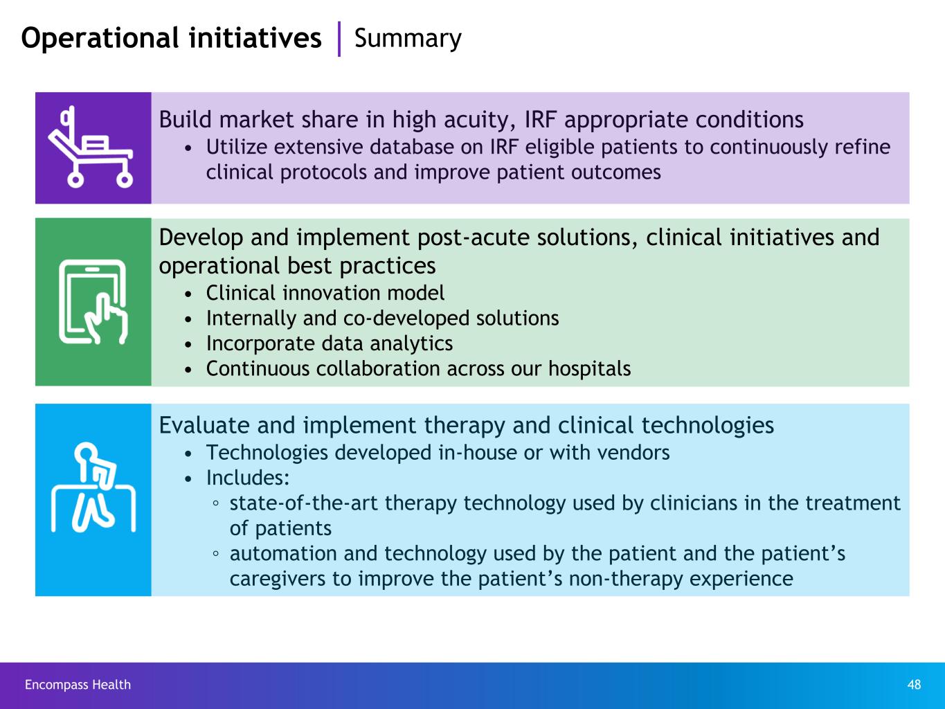 Encompass Health 48 Operational initiatives Summary Build market share in high acuity, IRF appropriate conditions • Utilize extensive database on IRF eligible patients to continuously refine clinical protocols and improve patient outcomes Develop and implement post-acute solutions, clinical initiatives and operational best practices • Clinical innovation model • Internally and co-developed solutions • Incorporate data analytics • Continuous collaboration across our hospitals Evaluate and implement therapy and clinical technologies • Technologies developed in-house or with vendors • Includes: ◦ state-of-the-art therapy technology used by clinicians in the treatment of patients ◦ automation and technology used by the patient and the patient’s caregivers to improve the patient’s non-therapy experience