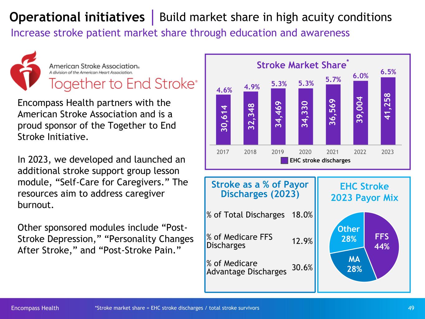 Encompass Health 49 Operational initiatives Build market share in high acuity conditions Increase stroke patient market share through education and awareness 2017 2018 2019 2020 2021 2022 2023 30 ,6 14 32 ,3 48 34 ,4 69 34 ,3 30 36 ,5 69 39 ,0 04 EHC stroke discharges Stroke Market Share* Stroke as a % of Payor Discharges (2023) % of Total Discharges 18.0% % of Medicare FFS Discharges 12.9% % of Medicare Advantage Discharges 30.6% 4.6% 4.9% 5.3% 5.3% 5.7% 6.0% EHC Stroke 2023 Payor Mix FFS 44% MA 28% Other 28% *Stroke market share = EHC stroke discharges / total stroke survivors 41 ,2 58 6.5% Encompass Health partners with the American Stroke Association and is a proud sponsor of the Together to End Stroke Initiative. In 2023, we developed and launched an additional stroke support group lesson module, “Self-Care for Caregivers.” The resources aim to address caregiver burnout. Other sponsored modules include “Post- Stroke Depression,” “Personality Changes After Stroke,” and “Post-Stroke Pain.”
