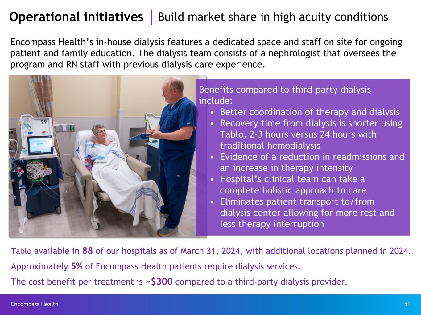 Encompass Health 51 Operational initiatives Build market share in high acuity conditions Tablo available in 88 of our hospitals as of March 31, 2024, with additional locations planned in 2024. Approximately 5% of Encompass Health patients require dialysis services. The cost benefit per treatment is ~$300 compared to a third-party dialysis provider. Encompass Health’s in-house dialysis features a dedicated space and staff on site for ongoing patient and family education. The dialysis team consists of a nephrologist that oversees the program and RN staff with previous dialysis care experience. Benefits compared to third-party dialysis include: • Better coordination of therapy and dialysis • Recovery time from dialysis is shorter using Tablo, 2-3 hours versus 24 hours with traditional hemodialysis • Evidence of a reduction in readmissions and an increase in therapy intensity • Hospital’s clinical team can take a complete holistic approach to care • Eliminates patient transport to/from dialysis center allowing for more rest and less therapy interruption