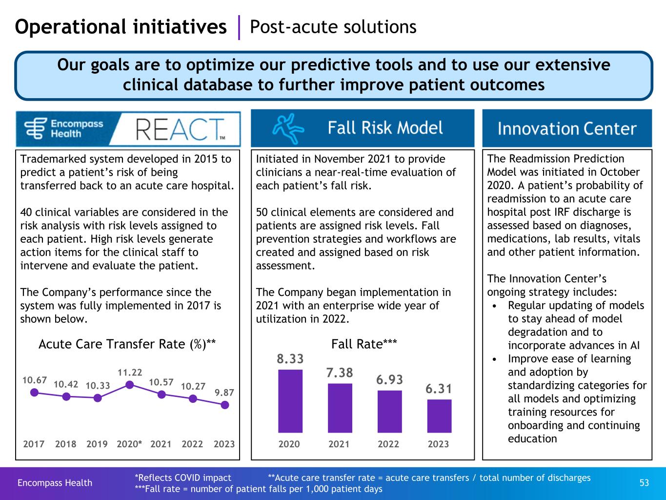 Encompass Health 53 Trademarked system developed in 2015 to predict a patient’s risk of being transferred back to an acute care hospital. 40 clinical variables are considered in the risk analysis with risk levels assigned to each patient. High risk levels generate action items for the clinical staff to intervene and evaluate the patient. The Company’s performance since the system was fully implemented in 2017 is shown below. Operational initiatives Post-acute solutions Initiated in November 2021 to provide clinicians a near-real-time evaluation of each patient’s fall risk. 50 clinical elements are considered and patients are assigned risk levels. Fall prevention strategies and workflows are created and assigned based on risk assessment. The Company began implementation in 2021 with an enterprise wide year of utilization in 2022. The Readmission Prediction Model was initiated in October 2020. A patient’s probability of readmission to an acute care hospital post IRF discharge is assessed based on diagnoses, medications, lab results, vitals and other patient information. The Innovation Center’s ongoing strategy includes: • Regular updating of models to stay ahead of model degradation and to incorporate advances in AI • Improve ease of learning and adoption by standardizing categories for all models and optimizing training resources for onboarding and continuing education *Reflects COVID impact **Acute care transfer rate = acute care transfers / total number of discharges ***Fall rate = number of patient falls per 1,000 patient days Our goals are to optimize our predictive tools and to use our extensive clinical database to further improve patient outcomes Acute Care Transfer Rate (%)** Fall Rate*** 8.33 7.38 6.93 6.31 2020 2021 2022 2023 10.67 10.42 10.33 11.22 10.57 10.27 9.87 2017 2018 2019 2020* 2021 2022 2023