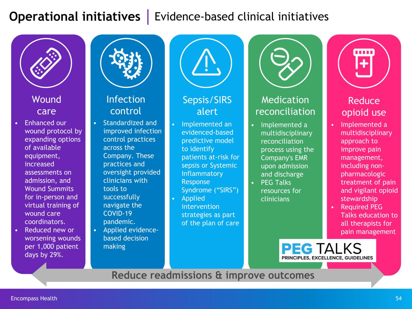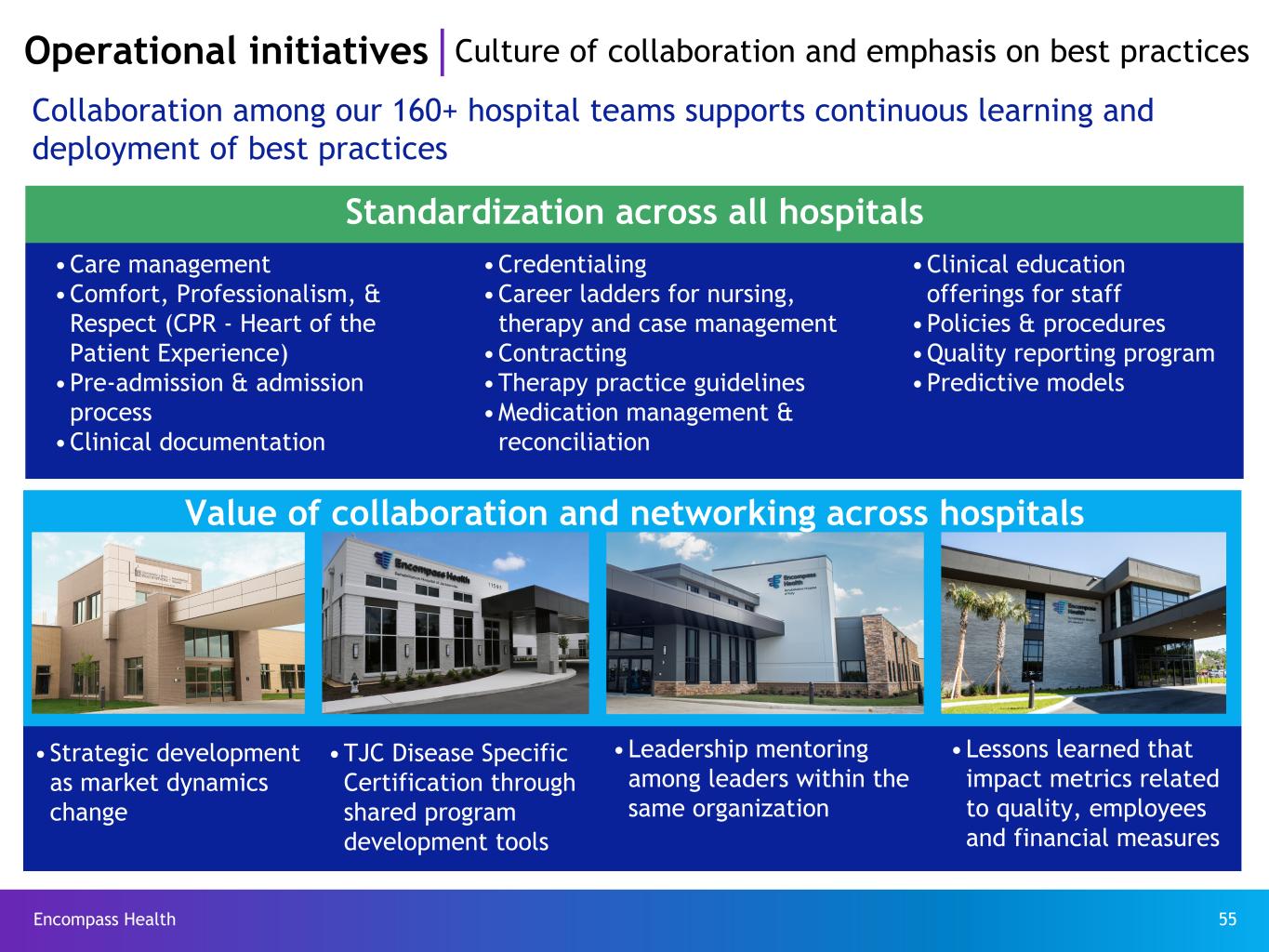 Encompass Health 54 • Standardized and improved infection control practices across the Company. These practices and oversight provided clinicians with tools to successfully navigate the COVID-19 pandemic. • Applied evidence- based decision making Sepsis/SIRS alert Infection control • Implemented an evidenced-based predictive model to identify patients at-risk for sepsis or Systemic Inflammatory Response Syndrome (“SIRS”) • Applied intervention strategies as part of the plan of care Medication reconciliation • Implemented a multidisciplinary reconciliation process using the Company's EMR upon admission and discharge • PEG Talks resources for clinicians Reduce opioid use • Implemented a multidisciplinary approach to improve pain management, including non- pharmacologic treatment of pain and vigilant opioid stewardship • Required PEG Talks education to all therapists for pain management Reduce readmissions & improve outcomes Operational initiatives Evidence-based clinical initiatives Wound care • Enhanced our wound protocol by expanding options of available equipment, increased assessments on admission, and Wound Summits for in-person and virtual training of wound care coordinators. • Reduced new or worsening wounds per 1,000 patient days by 29%.