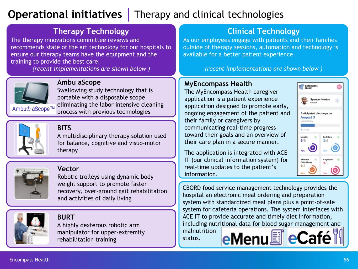 Encompass Health 56 Operational initiatives Therapy and clinical technologies Therapy Technology The therapy innovations committee reviews and recommends state of the art technology for our hospitals to ensure our therapy teams have the equipment and the training to provide the best care. (recent implementations are shown below ) Clinical Technology As our employees engage with patients and their families outside of therapy sessions, automation and technology is available for a better patient experience. (recent implementations are shown below ) Ambu aScope Swallowing study technology that is portable with a disposable scope eliminating the labor intensive cleaning process with previous technologies BITS A multidisciplinary therapy solution used for balance, cognitive and visuo-motor therapy Vector Robotic trolleys using dynamic body weight support to promote faster recovery, over-ground gait rehabilitation and activities of daily living BURT A highly dexterous robotic arm manipulator for upper-extremity rehabilitation training MyEncompass Health The MyEncompass Health caregiver application is a patient experience application designed to promote early, ongoing engagement of the patient and their family or caregivers by communicating real-time progress toward their goals and an overview of their care plan in a secure manner. The application is integrated with ACE IT (our clinical information system) for real-time updates to the patient’s information. CBORD food service management technology provides the hospital an electronic meal ordering and preparation system with standardized meal plans plus a point-of-sale system for cafeteria operations. The system interfaces with ACE IT to provide accurate and timely diet information, including nutritional data for blood sugar management and malnutrition status.
