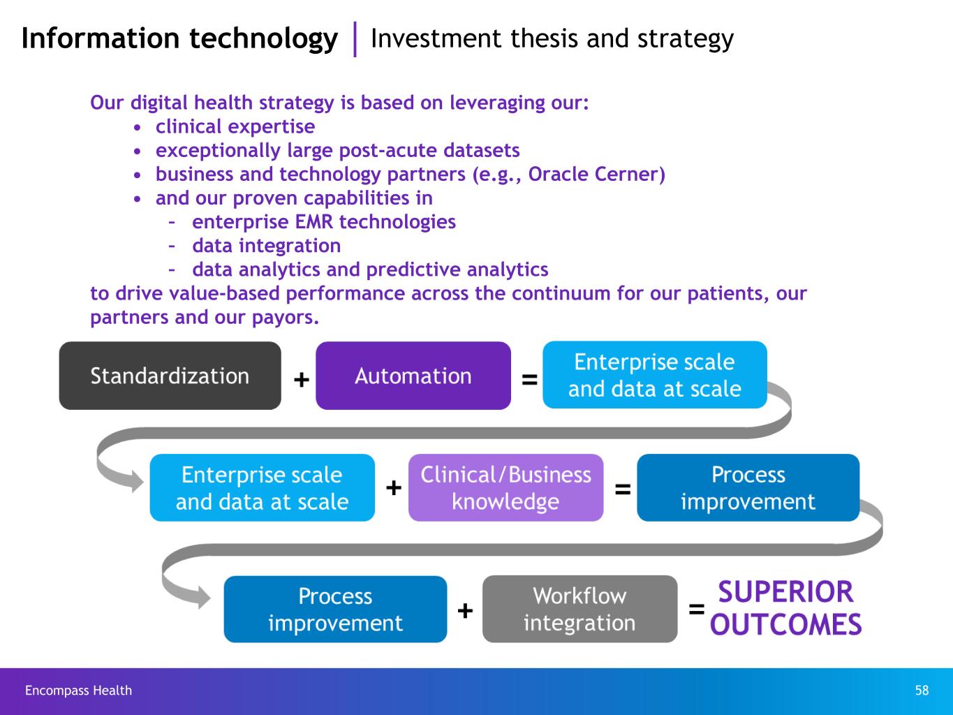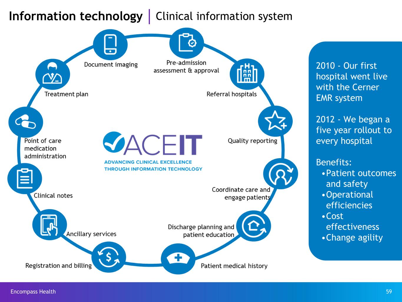 Encompass Health 58 Information technology Investment thesis and strategy Our digital health strategy is based on leveraging our: • clinical expertise • exceptionally large post-acute datasets • business and technology partners (e.g., Oracle Cerner) • and our proven capabilities in – enterprise EMR technologies – data integration – data analytics and predictive analytics to drive value-based performance across the continuum for our patients, our partners and our payors.
