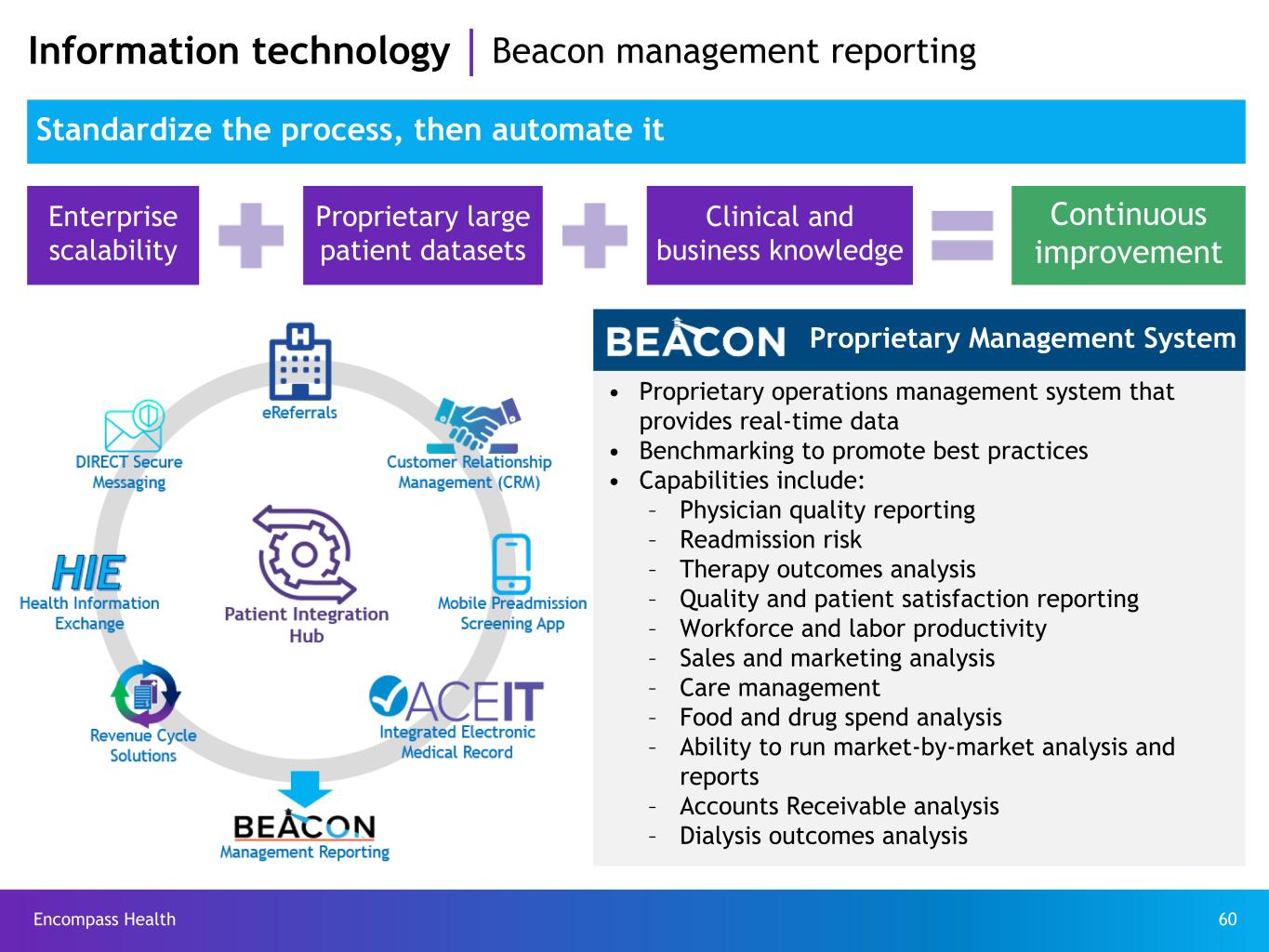 Encompass Health 60 Information technology Beacon management reporting Standardize the process, then automate it Enterprise scalability Proprietary large patient datasets Clinical and business knowledge Continuous improvement Proprietary Management System • Proprietary operations management system that provides real-time data • Benchmarking to promote best practices • Capabilities include: – Physician quality reporting – Readmission risk – Therapy outcomes analysis – Quality and patient satisfaction reporting – Workforce and labor productivity – Sales and marketing analysis – Care management – Food and drug spend analysis – Ability to run market-by-market analysis and reports – Accounts Receivable analysis – Dialysis outcomes analysis
