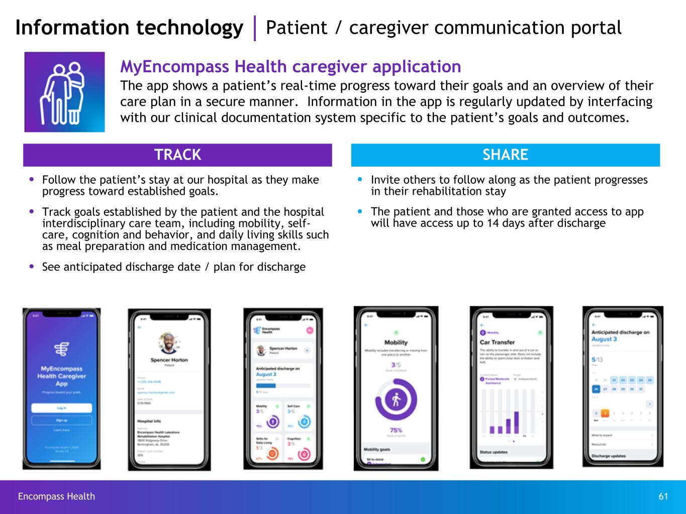 Encompass Health 61 Information technology Patient / caregiver communication portal MyEncompass Health caregiver application The app shows a patient’s real-time progress toward their goals and an overview of their care plan in a secure manner. Information in the app is regularly updated by interfacing with our clinical documentation system specific to the patient’s goals and outcomes. TRACK SHARE ● Follow the patient’s stay at our hospital as they make progress toward established goals. ● Invite others to follow along as the patient progresses in their rehabilitation stay ● Track goals established by the patient and the hospital interdisciplinary care team, including mobility, self- care, cognition and behavior, and daily living skills such as meal preparation and medication management. ● The patient and those who are granted access to app will have access up to 14 days after discharge ● See anticipated discharge date / plan for discharge
