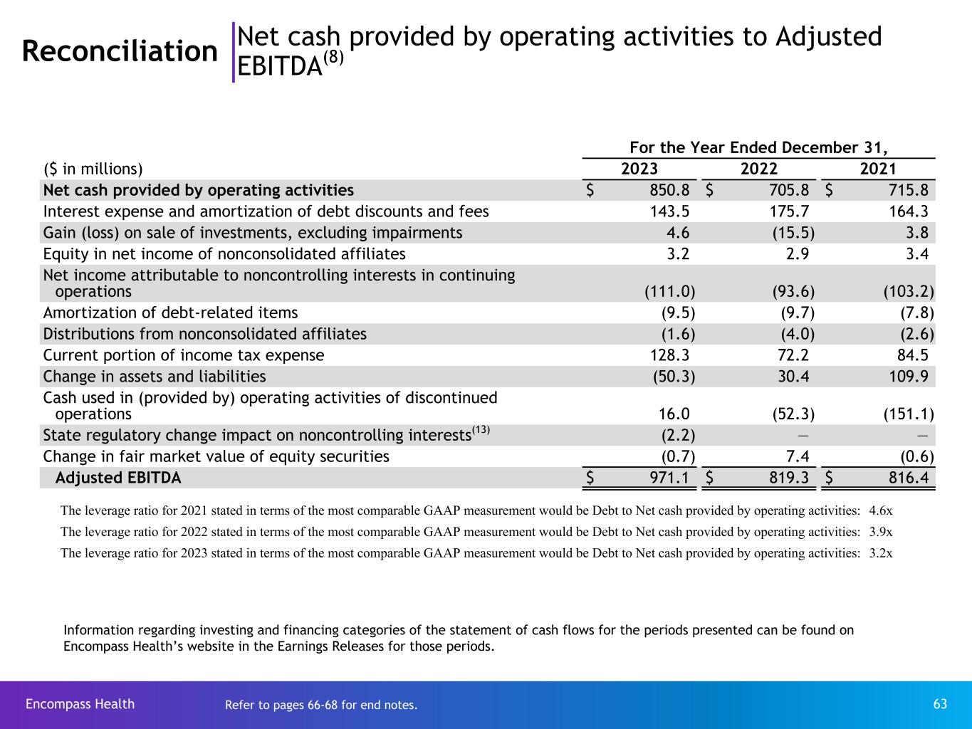 Encompass Health 63 Reconciliation Net cash provided by operating activities to Adjusted EBITDA(8) For the Year Ended December 31, ($ in millions) 2023 2022 2021 Net cash provided by operating activities $ 850.8 $ 705.8 $ 715.8 Interest expense and amortization of debt discounts and fees 143.5 175.7 164.3 Gain (loss) on sale of investments, excluding impairments 4.6 (15.5) 3.8 Equity in net income of nonconsolidated affiliates 3.2 2.9 3.4 Net income attributable to noncontrolling interests in continuing operations (111.0) (93.6) (103.2) Amortization of debt-related items (9.5) (9.7) (7.8) Distributions from nonconsolidated affiliates (1.6) (4.0) (2.6) Current portion of income tax expense 128.3 72.2 84.5 Change in assets and liabilities (50.3) 30.4 109.9 Cash used in (provided by) operating activities of discontinued operations 16.0 (52.3) (151.1) State regulatory change impact on noncontrolling interests(13) (2.2) — — Change in fair market value of equity securities (0.7) 7.4 (0.6) Adjusted EBITDA $ 971.1 $ 819.3 $ 816.4 Information regarding investing and financing categories of the statement of cash flows for the periods presented can be found on Encompass Health’s website in the Earnings Releases for those periods. The leverage ratio for 2021 stated in terms of the most comparable GAAP measurement would be Debt to Net cash provided by operating activities: 4.6x The leverage ratio for 2022 stated in terms of the most comparable GAAP measurement would be Debt to Net cash provided by operating activities: 3.9x The leverage ratio for 2023 stated in terms of the most comparable GAAP measurement would be Debt to Net cash provided by operating activities: 3.2x Refer to pages 66-68 for end notes.