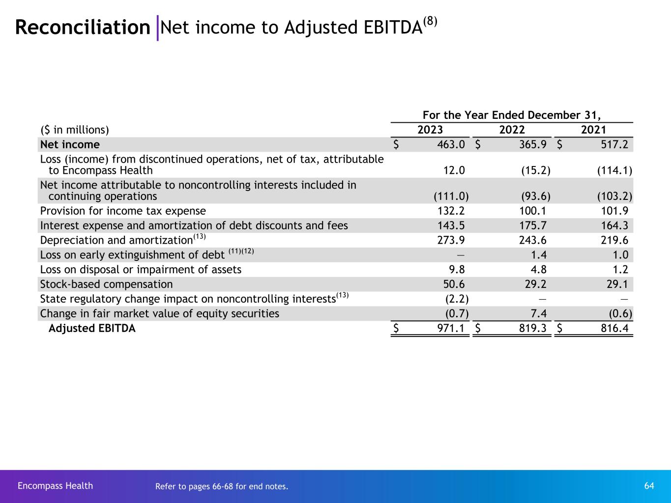 Encompass Health 64 Reconciliation Net income to Adjusted EBITDA(8) For the Year Ended December 31, ($ in millions) 2023 2022 2021 Net income $ 463.0 $ 365.9 $ 517.2 Loss (income) from discontinued operations, net of tax, attributable to Encompass Health 12.0 (15.2) (114.1) Net income attributable to noncontrolling interests included in continuing operations (111.0) (93.6) (103.2) Provision for income tax expense 132.2 100.1 101.9 Interest expense and amortization of debt discounts and fees 143.5 175.7 164.3 Depreciation and amortization(13) 273.9 243.6 219.6 Loss on early extinguishment of debt (11)(12) — 1.4 1.0 Loss on disposal or impairment of assets 9.8 4.8 1.2 Stock-based compensation 50.6 29.2 29.1 State regulatory change impact on noncontrolling interests(13) (2.2) — — Change in fair market value of equity securities (0.7) 7.4 (0.6) Adjusted EBITDA $ 971.1 $ 819.3 $ 816.4 Refer to pages 66-68 for end notes.