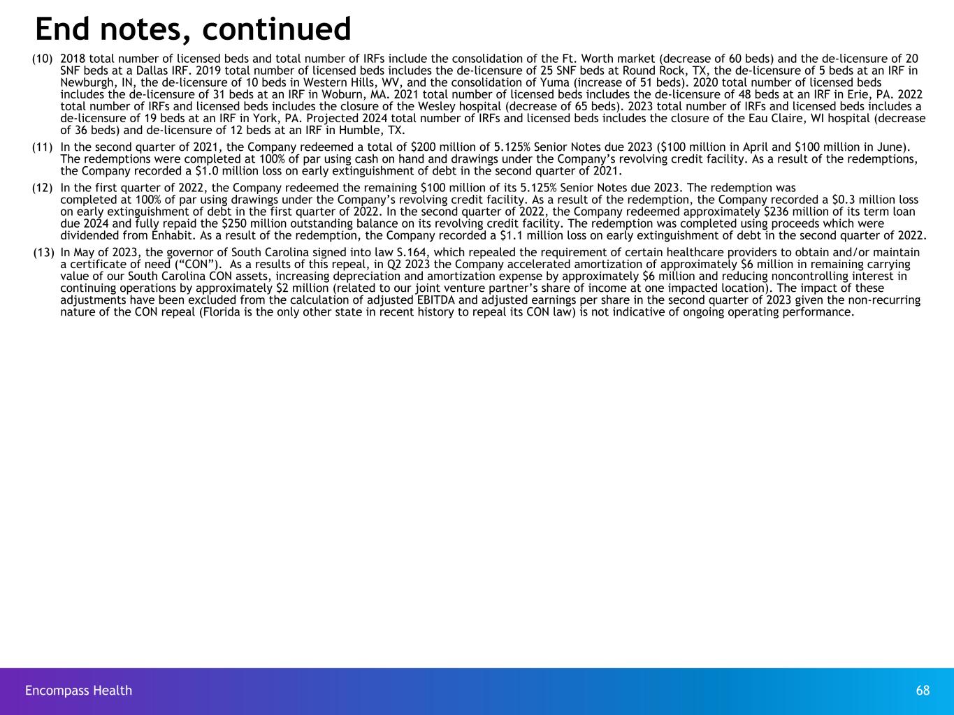 Encompass Health 68 (10) 2018 total number of licensed beds and total number of IRFs include the consolidation of the Ft. Worth market (decrease of 60 beds) and the de-licensure of 20 SNF beds at a Dallas IRF. 2019 total number of licensed beds includes the de-licensure of 25 SNF beds at Round Rock, TX, the de-licensure of 5 beds at an IRF in Newburgh, IN, the de-licensure of 10 beds in Western Hills, WV, and the consolidation of Yuma (increase of 51 beds). 2020 total number of licensed beds includes the de-licensure of 31 beds at an IRF in Woburn, MA. 2021 total number of licensed beds includes the de-licensure of 48 beds at an IRF in Erie, PA. 2022 total number of IRFs and licensed beds includes the closure of the Wesley hospital (decrease of 65 beds). 2023 total number of IRFs and licensed beds includes a de-licensure of 19 beds at an IRF in York, PA. Projected 2024 total number of IRFs and licensed beds includes the closure of the Eau Claire, WI hospital (decrease of 36 beds) and de-licensure of 12 beds at an IRF in Humble, TX. (11) In the second quarter of 2021, the Company redeemed a total of $200 million of 5.125% Senior Notes due 2023 ($100 million in April and $100 million in June). The redemptions were completed at 100% of par using cash on hand and drawings under the Company’s revolving credit facility. As a result of the redemptions, the Company recorded a $1.0 million loss on early extinguishment of debt in the second quarter of 2021. (12) In the first quarter of 2022, the Company redeemed the remaining $100 million of its 5.125% Senior Notes due 2023. The redemption was completed at 100% of par using drawings under the Company’s revolving credit facility. As a result of the redemption, the Company recorded a $0.3 million loss on early extinguishment of debt in the first quarter of 2022. In the second quarter of 2022, the Company redeemed approximately $236 million of its term loan due 2024 and fully repaid the $250 million outstanding balance on its revolving credit facility. The redemption was completed using proceeds which were dividended from Enhabit. As a result of the redemption, the Company recorded a $1.1 million loss on early extinguishment of debt in the second quarter of 2022. (13) In May of 2023, the governor of South Carolina signed into law S.164, which repealed the requirement of certain healthcare providers to obtain and/or maintain a certificate of need (“CON”). As a results of this repeal, in Q2 2023 the Company accelerated amortization of approximately $6 million in remaining carrying value of our South Carolina CON assets, increasing depreciation and amortization expense by approximately $6 million and reducing noncontrolling interest in continuing operations by approximately $2 million (related to our joint venture partner’s share of income at one impacted location). The impact of these adjustments have been excluded from the calculation of adjusted EBITDA and adjusted earnings per share in the second quarter of 2023 given the non-recurring nature of the CON repeal (Florida is the only other state in recent history to repeal its CON law) is not indicative of ongoing operating performance. End notes, continued