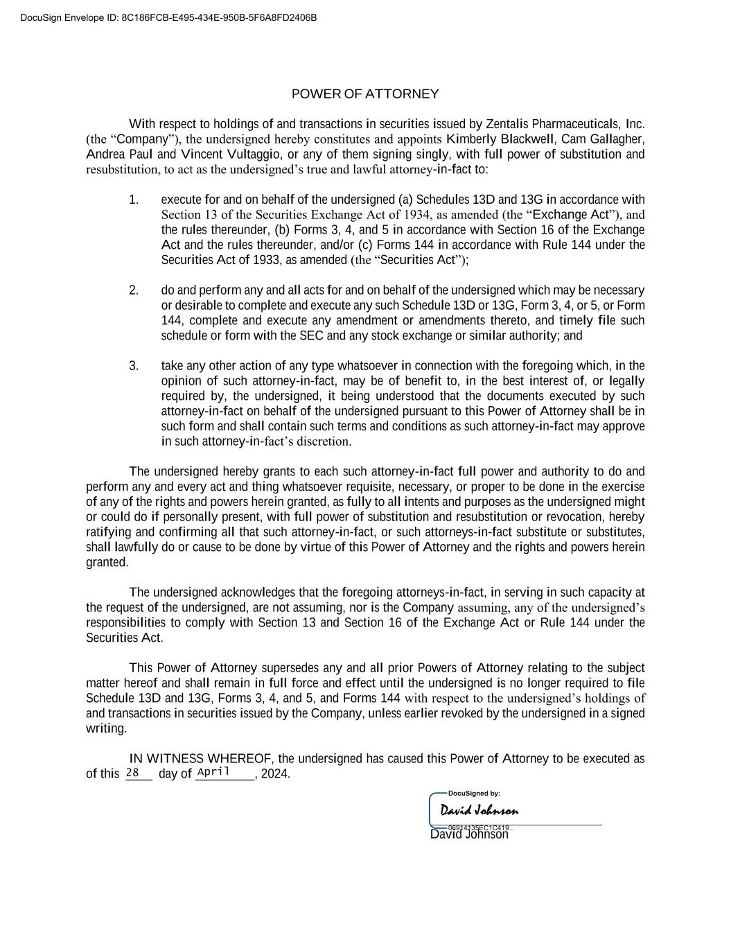 POWER OF ATTORNEY With respect to holdings of and transactions in securities issued by Zentalis Pharmaceuticals, Inc. (the “Company”), the undersigned hereby constitutes and appoints Kimberly Blackwell, Cam Gallagher, Andrea Paul and Vincent Vultaggio, or any of them signing singly, with full power of substitution and resubstitution, to act as the undersigned’s true and lawful attorney-in-fact to: 1. execute for and on behalf of the undersigned (a) Schedules 13D and 13G in accordance with Section 13 of the Securities Exchange Act of 1934, as amended (the “Exchange Act”), and the rules thereunder, (b) Forms 3, 4, and 5 in accordance with Section 16 of the Exchange Act and the rules thereunder, and/or (c) Forms 144 in accordance with Rule 144 under the Securities Act of 1933, as amended (the “Securities Act”); 2. do and perform any and all acts for and on behalf of the undersigned which may be necessary or desirable to complete and execute any such Schedule 13D or 13G, Form 3, 4, or 5, or Form 144, complete and execute any amendment or amendments thereto, and timely file such schedule or form with the SEC and any stock exchange or similar authority; and 3. take any other action of any type whatsoever in connection with the foregoing which, in the opinion of such attorney-in-fact, may be of benefit to, in the best interest of, or legally required by, the undersigned, it being understood that the documents executed by such attorney-in-fact on behalf of the undersigned pursuant to this Power of Attorney shall be in such form and shall contain such terms and conditions as such attorney-in-fact may approve in such attorney-in-fact’s discretion. The undersigned hereby grants to each such attorney-in-fact full power and authority to do and perform any and every act and thing whatsoever requisite, necessary, or proper to be done in the exercise of any of the rights and powers herein granted, as fully to all intents and purposes as the undersigned might or could do if personally present, with full power of substitution and resubstitution or revocation, hereby ratifying and confirming all that such attorney-in-fact, or such attorneys-in-fact substitute or substitutes, shall lawfully do or cause to be done by virtue of this Power of Attorney and the rights and powers herein granted. The undersigned acknowledges that the foregoing attorneys-in-fact, in serving in such capacity at the request of the undersigned, are not assuming, nor is the Company assuming, any of the undersigned’s responsibilities to comply with Section 13 and Section 16 of the Exchange Act or Rule 144 under the Securities Act. This Power of Attorney supersedes any and all prior Powers of Attorney relating to the subject matter hereof and shall remain in full force and effect until the undersigned is no longer required to file Schedule 13D and 13G, Forms 3, 4, and 5, and Forms 144 with respect to the undersigned’s holdings of and transactions in securities issued by the Company, unless earlier revoked by the undersigned in a signed writing. IN WITNESS WHEREOF, the undersigned has caused this Power of Attorney to be executed as of this ____ day of _________, 2024. David Johnson DocuSign Envelope ID: 8C186FCB-E495-434E-950B-5F6A8FD2406B 28 April