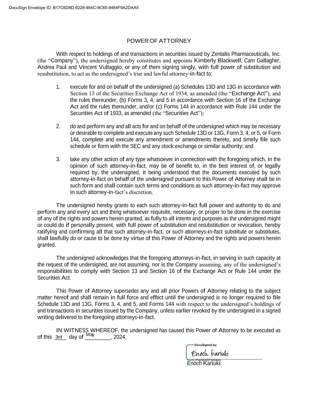 POWER OF ATTORNEY With respect to holdings of and transactions in securities issued by Zentalis Pharmaceuticals, Inc. (the “Company”), the undersigned hereby constitutes and appoints Kimberly Blackwell, Cam Gallagher, Andrea Paul and Vincent Vultaggio, or any of them signing singly, with full power of substitution and resubstitution, to act as the undersigned’s true and lawful attorney-in-fact to: 1. execute for and on behalf of the undersigned (a) Schedules 13D and 13G in accordance with Section 13 of the Securities Exchange Act of 1934, as amended (the “Exchange Act”), and the rules thereunder, (b) Forms 3, 4, and 5 in accordance with Section 16 of the Exchange Act and the rules thereunder, and/or (c) Forms 144 in accordance with Rule 144 under the Securities Act of 1933, as amended (the “Securities Act”); 2. do and perform any and all acts for and on behalf of the undersigned which may be necessary or desirable to complete and execute any such Schedule 13D or 13G, Form 3, 4, or 5, or Form 144, complete and execute any amendment or amendments thereto, and timely file such schedule or form with the SEC and any stock exchange or similar authority; and 3. take any other action of any type whatsoever in connection with the foregoing which, in the opinion of such attorney-in-fact, may be of benefit to, in the best interest of, or legally required by, the undersigned, it being understood that the documents executed by such attorney-in-fact on behalf of the undersigned pursuant to this Power of Attorney shall be in such form and shall contain such terms and conditions as such attorney-in-fact may approve in such attorney-in-fact’s discretion. The undersigned hereby grants to each such attorney-in-fact full power and authority to do and perform any and every act and thing whatsoever requisite, necessary, or proper to be done in the exercise of any of the rights and powers herein granted, as fully to all intents and purposes as the undersigned might or could do if personally present, with full power of substitution and resubstitution or revocation, hereby ratifying and confirming all that such attorney-in-fact, or such attorneys-in-fact substitute or substitutes, shall lawfully do or cause to be done by virtue of this Power of Attorney and the rights and powers herein granted. The undersigned acknowledges that the foregoing attorneys-in-fact, in serving in such capacity at the request of the undersigned, are not assuming, nor is the Company assuming, any of the undersigned’s responsibilities to comply with Section 13 and Section 16 of the Exchange Act or Rule 144 under the Securities Act. This Power of Attorney supersedes any and all prior Powers of Attorney relating to the subject matter hereof and shall remain in full force and effect until the undersigned is no longer required to file Schedule 13D and 13G, Forms 3, 4, and 5, and Forms 144 with respect to the undersigned’s holdings of and transactions in securities issued by the Company, unless earlier revoked by the undersigned in a signed writing delivered to the foregoing attorneys-in-fact. IN WITNESS WHEREOF, the undersigned has caused this Power of Attorney to be executed as of this ____ day of _________, 2024. Enoch Kariuki DocuSign Envelope ID: B17C6D8D-9228-464C-9C65-9464F9A2DAA5 3rd May