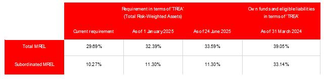 3 The MREL requirement (“Total MREL”) is expressed as percentages of the Resolution Group’s total risk-weighted assets (Total Risk Exposure Amount, “TREA”) and of leverage exposure (Leverage Ratio Exposure, “LRE”) as of 31 December 2022. Within this Total MREL, a requirement which must be met through own funds and subordinated eligible liabilities (“Subordinated MREL”) has been determined. The MREL requirement in terms of TREA and the subordination requirement in terms of TREA do not include the applicable Combined Capital Buffer. The Combined Capital Buffer applicable on the TREA, in accordance with the applicable regulation and the supervisory criteria, is currently 4.09%. Total MREL requirement plus the Combined Capital Buffer applicable on the TREA is: (i) currently 33.78%; (ii) 36.48% as of 1 January 2025; and (iii) 37.68% as of 24 June 2025.