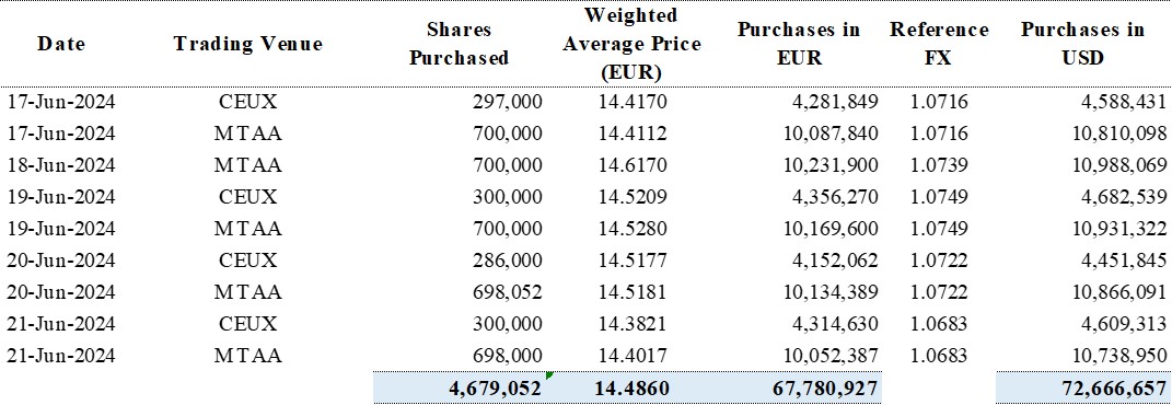 From June 17, 2024 to (and including) June 21, 2024, the Company has purchased a total of 4,679,052 ordinary shares for a total consideration of €67,780,927, equivalent to USD72,666,657.