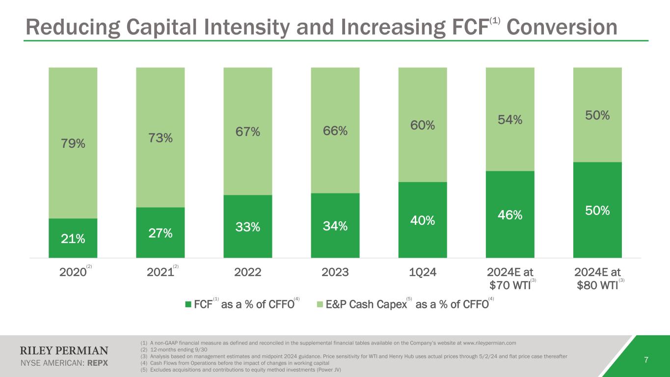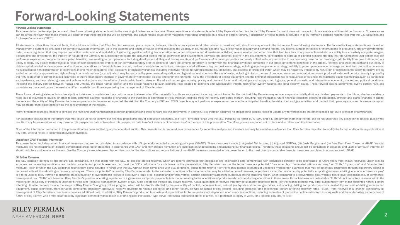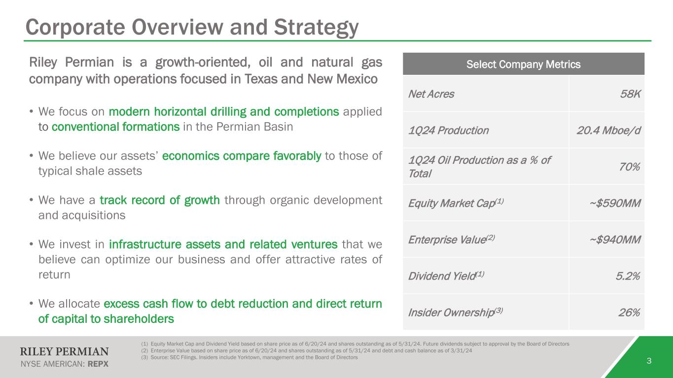 2 Forward-Looking Statements Forward-Looking Statements This presentation contains projections and other forward-looking statements within the meaning of federal securities laws. These projections and statements reflect Riley Exploration Permian, Inc.’s (“Riley Permian”) current views with respect to future events and financial performance. No assurances can be given, however, that these events will occur or that these projections will be achieved, and actual results could differ materially from those projected as a result of certain factors. A discussion of these factors is included in Riley Permian’s periodic reports filed with the U.S. Securities and Exchange Commission (“SEC”). All statements, other than historical facts, that address activities that Riley Permian assumes, plans, expects, believes, intends or anticipates (and other similar expressions) will, should or may occur in the future are forward-looking statements. The forward-looking statements are based on management’s current beliefs, based on currently available information, as to the outcome and timing of future events, including the volatility of oil, natural gas and NGL prices; regional supply and demand factors, any delays, curtailment delays or interruptions of production, and any governmental order, rule or regulation that may impose production limits; cost and availability of gathering, pipeline, refining, transportation and other midstream and downstream activities; severe weather and other risks that lead to a lack of any available markets; our ability to successfully complete mergers, acquisitions and divestitures; the inability or failure of the Company to successfully integrate the acquired assets into its operations and development activities; the potential delays in the development, construction or start-up of planned projects; the risk that the Company's EOR project may not perform as expected or produce the anticipated benefits; risks relating to our operations, including development drilling and testing results and performance of acquired properties and newly drilled wells; any reduction in our borrowing base on our revolving credit facility from time to time and our ability to repay any excess borrowings as a result of such reduction; the impact of our derivative strategy and the results of future settlement; our ability to comply with the financial covenants contained in our credit agreement; conditions in the capital, financial and credit markets and our ability to obtain capital needed for development and exploration operations on favorable terms or at all; the loss of certain tax deductions; risks associated with executing our business strategy, including any changes in our strategy; inability to prove up undeveloped acreage and maintain production on leases; risks associated with concentration of operations in one major geographic area; legislative or regulatory changes, including initiatives related to hydraulic fracturing, emissions, and disposal of produced water, which may be negatively impacted by regulation or legislation; the ability to receive drilling and other permits or approvals and rights-of-way in a timely manner (or at all), which may be restricted by governmental regulation and legislation; restrictions on the use of water, including limits on the use of produced water and a moratorium on new produced water well permits recently imposed by the RRC in an effort to control induced seismicity in the Permian Basin; changes in government environmental policies and other environmental risks; the availability of drilling equipment and the timing of production; tax consequences of business transactions; public health crisis, such as pandemics and epidemics, and any related government policies and actions and the effects of such public health crises on the oil and natural gas industry, pricing and demand for oil and natural gas and supply chain logistics; general domestic and international economic, market and political conditions, including the military conflict between Russia and Ukraine, the Israel-Hamas conflict and the global response to such conflicts; risks related to litigation; and cybersecurity threats, technology system failures and data security issues. These forward-looking statements involve certain risks and uncertainties that could cause the results to differ materially from those expected by the management of Riley Permian. These forward-looking statements involve significant risks and uncertainties that could cause actual results to differ materially from those anticipated, including, but not limited to, the risk that Riley Permian may reduce, suspend or totally eliminate dividend payments in the future, whether variable or fixed, due to insufficient liquidity or other factors, potential adverse reactions or changes to the business or operations of Riley Permian resulting from the recently completed merger, including Riley Permian’s future financial condition, results of operations, strategy and plans; changes in capital markets and the ability of Riley Permian to finance operations in the manner expected; the risk that the Company’s EOR and CCUS projects may not perform as expected or produce the anticipated benefits; the risks of oil and gas activities; and the fact that operating costs and business disruption may be greater than expected following the consummation of the merger. Riley Permian encourages readers to consider the risks and uncertainties associated with projections and other forward-looking statements. In addition, Riley Permian assumes no obligation to publicly revise or update any forward-looking statements based on future events or circumstances. For additional discussion of the factors that may cause us not to achieve our financial projections and/or production estimates, see Riley Permian’s filings with the SEC, including its forms 10-K, 10-Q and 8-K and any amendments thereto. We do not undertake any obligation to release publicly th