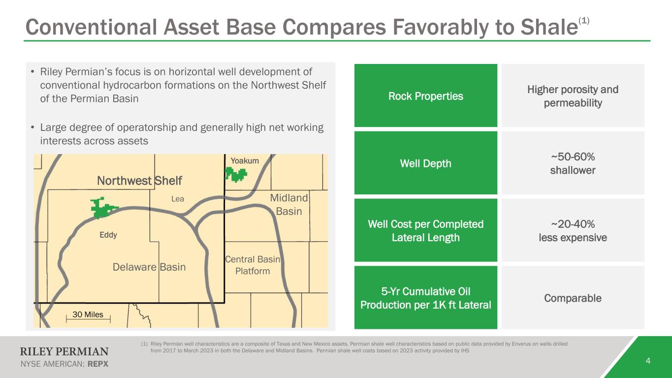 Corporate Overview and Strategy Riley Permian is a growth-oriented, oil and natural gas company with operations focused in Texas and New Mexico • We focus on modern horizontal drilling and completions applied to conventional formations in the Permian Basin • We believe our assets’ economics compare favorably to those of typical shale assets • We have a track record of growth through organic development and acquisitions • We invest in infrastructure assets and related ventures that we believe can optimize our business and offer attractive rates of return • We allocate excess cash flow to debt reduction and direct return of capital to shareholders 3 (1) Equity Market Cap and Dividend Yield based on share price as of 6/20/24 and shares outstanding as of 5/31/24. Future dividends subject to approval by the Board of Directors (2) Enterprise Value based on share price as of 6/20/24 and shares outstanding as of 5/31/24 and debt and cash balance as of 3/31/24 (3) Source: SEC Filings. Insiders include Yorktown, management and the Board of Directors Select Company Metrics Net Acres 58K 1Q24 Production 20.4 Mboe/d 1Q24 Oil Production as a % of Total 70% Equity Market Cap(1) ~$590MM Enterprise Value(2) ~$940MM Dividend Yield(1) 5.2% Insider Ownership(3) 26%
