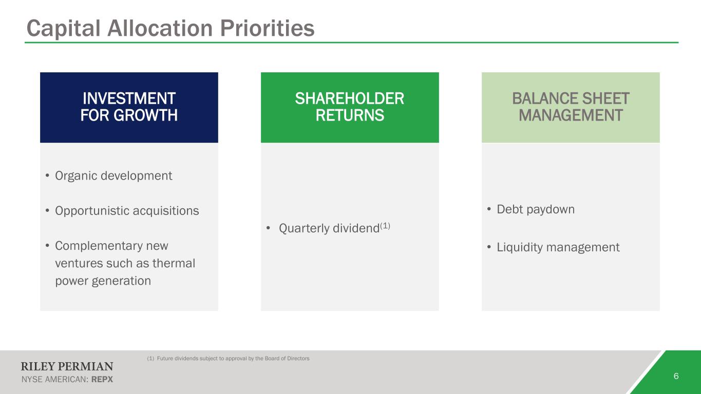 Track Record of Growth 5 CFFO(1) $MM FCF(2) $MM Shareholders’ Equity $MM (1) Cash Flows from Operations before the impact of changes in working capital (2) A non-GAAP financial measure as defined and reconciled in the supplemental financial tables available on the Company’s website at www.rileypermian.com (3) Last Twelve Months 89 169 206 227 2021 2022 2023 LTM 1Q24 8 56 70 91 2021 2022 2023 LTM 1Q24 (3) (3) 238 333 422 435 2021 2022 2023 1Q24