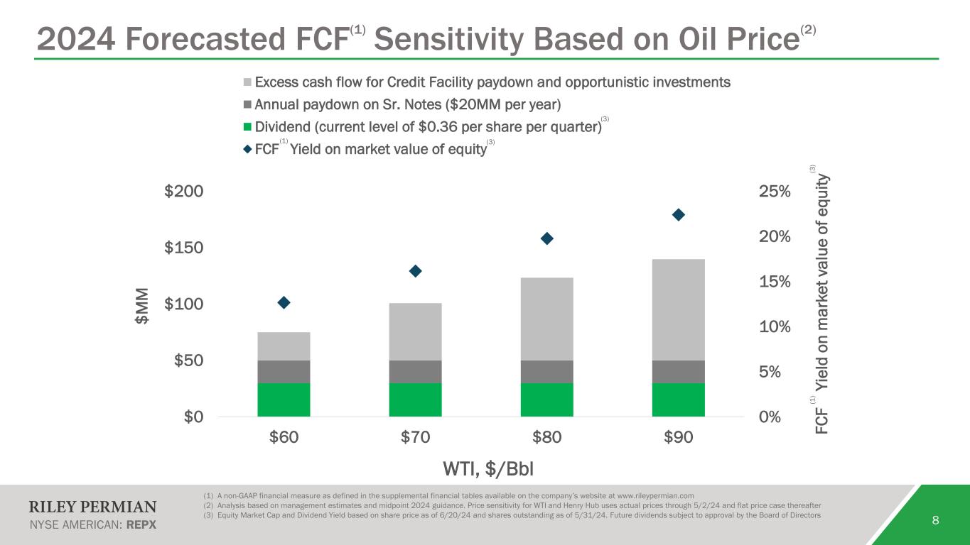 21% 27% 33% 34% 40% 46% 50% 79% 73% 67% 66% 60% 54% 50% 2020 2021 2022 2023 1Q24 2024E at $70 WTI 2024E at $80 WTI FCF as a % of CFFO E&P Cash Capex as a % of CFFO 7 Reducing Capital Intensity and Increasing FCF(1) Conversion (1) A non-GAAP financial measure as defined and reconciled in the supplemental financial tables available on the Company’s website at www.rileypermian.com (2) 12-months ending 9/30 (3) Analysis based on management estimates and midpoint 2024 guidance. Price sensitivity for WTI and Henry Hub uses actual prices through 5/2/24 and flat price case thereafter (4) Cash Flows from Operations before the impact of changes in working capital (5) Excludes acquisitions and contributions to equity method investments (Power JV) (2) (1) (2) (3) (4) (3) (4)(5)