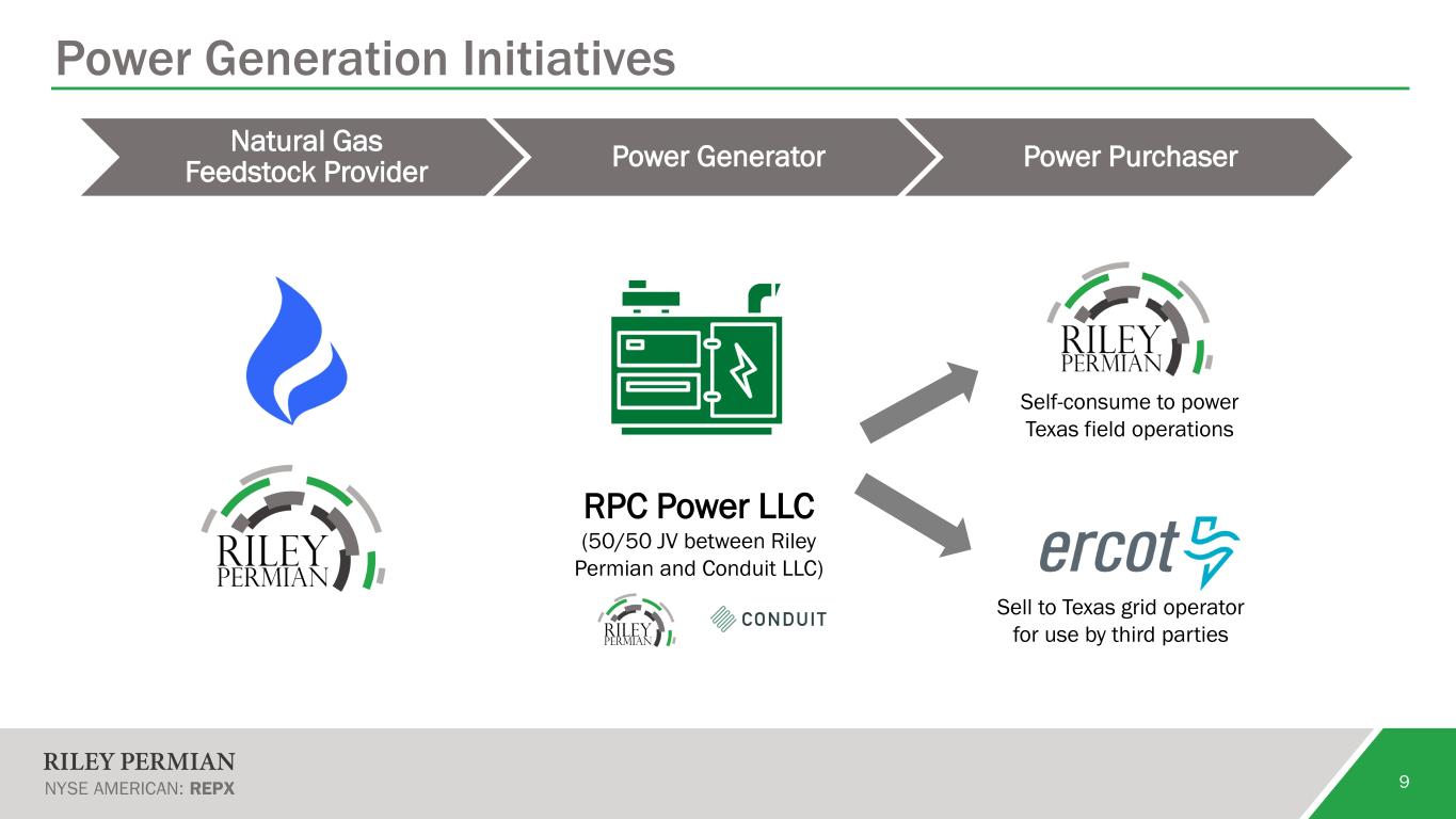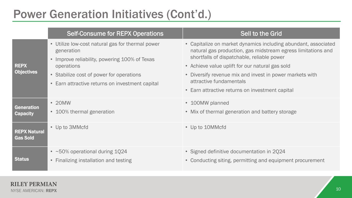 Power Generation Initiatives 9 Natural Gas Feedstock Provider Power Generator Power Purchaser RPC Power LLC (50/50 JV between Riley Permian and Conduit LLC) Self-consume to power Texas field operations Sell to Texas grid operator for use by third parties